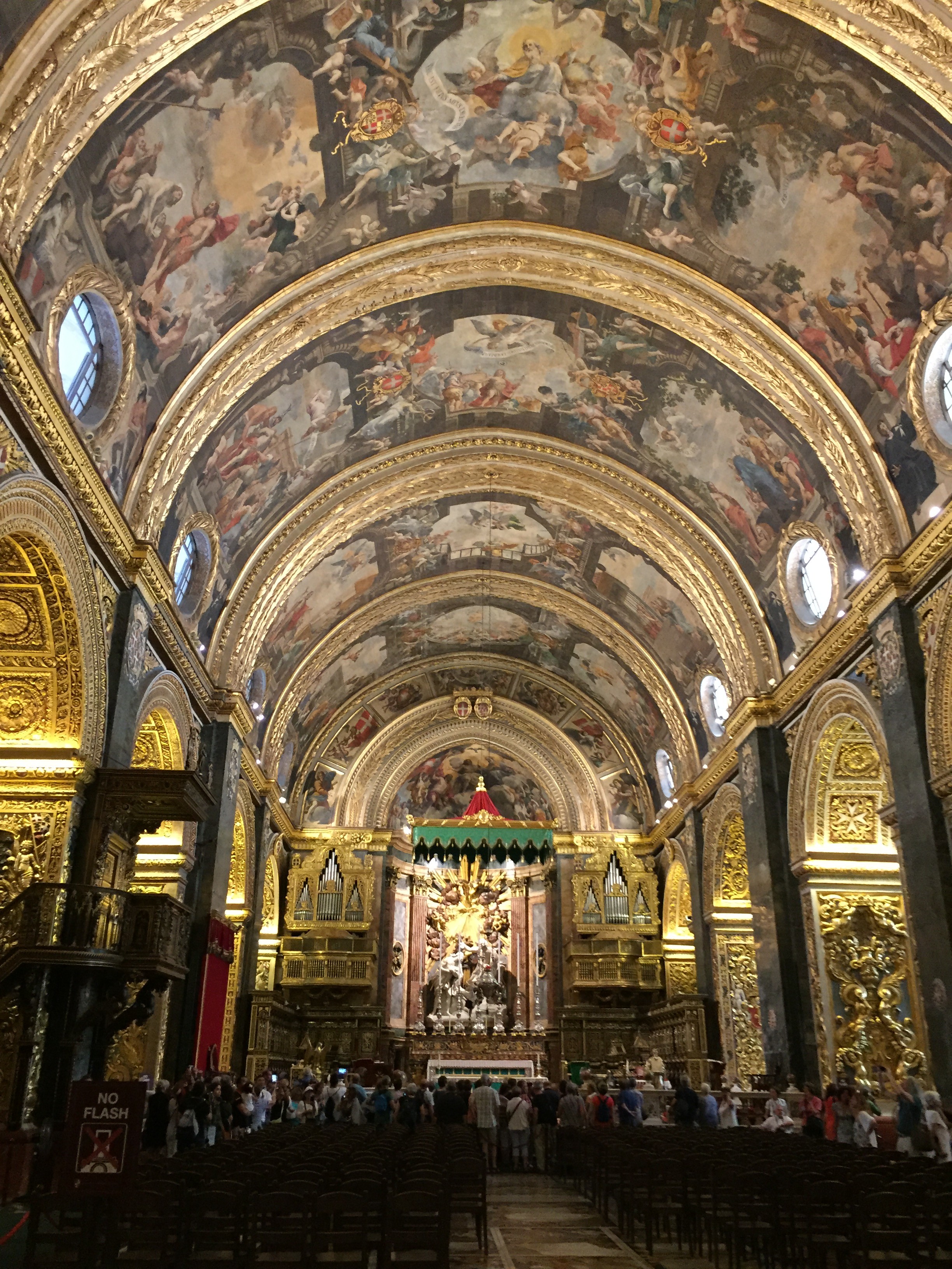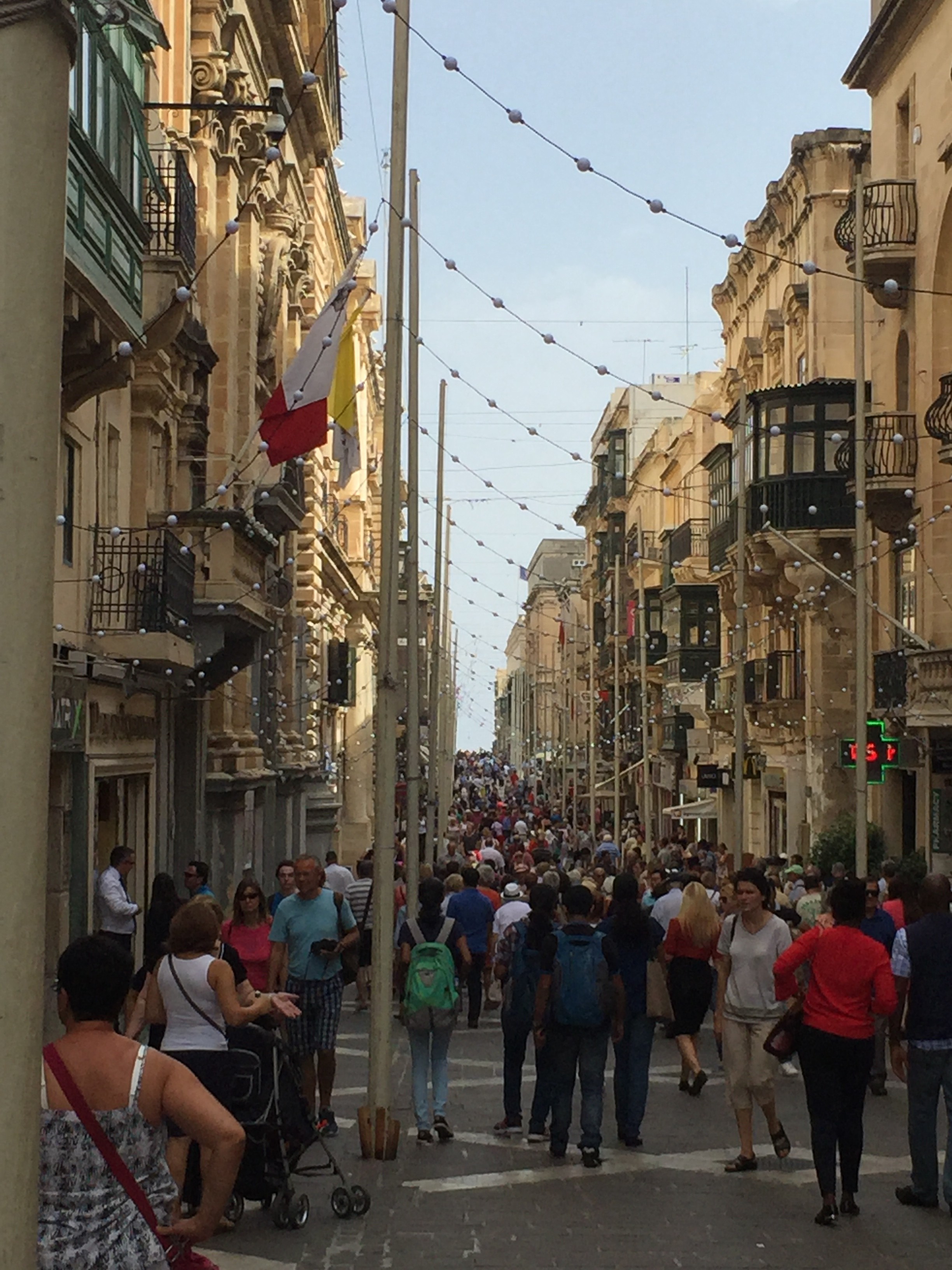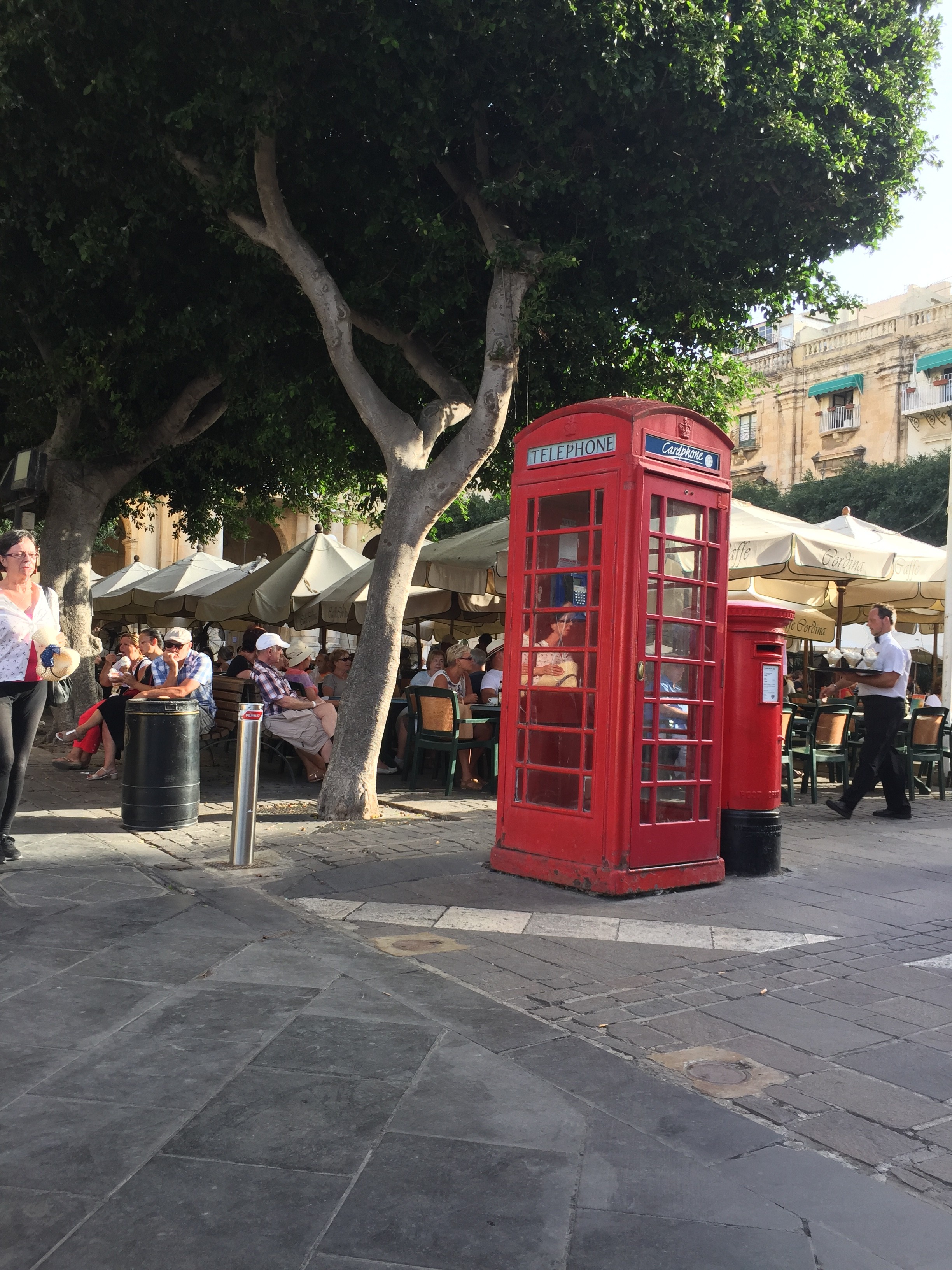 My conclusions about our apartment were bunk. Turns out it’s an oasis in a sea of humanity and humidity. We found a close by place for breakfast – 5 euroes for a full English breakfast. The British governed Malta for about 50 years, leaving in 1965. So there’s still a heavy British presence here with Red phone boxes all around and a statue of Queen Victoria in front of the library. One of the must see sights is St. John’s Co-Cathedral so we set off to visit it. The narrow streets were almost shoulder to shoulder with people, many of whom were with cruise ship guides. There was a huge queue in front of the Cathedral but most were with large groups. There was a separate line for individual tickets which was much shorter. The Cathedral is as magnificent as expected and we did get to see its pride and joy – a painting by Caravaggio of the Beheading of John the Baptist. The next place on my list was the upper Barrakka Garden. At last, the sea! It is more of a protected plaza than a garden, with great views of the harbor and a breeze! We stopped to have a bite of lunch and a drink. Both of us were drenched with sweat. I couldn’t even eat. We checked out the War Rooms but the thought of descending and then ascending 120 stairs was more than we thought we could manage. So we did a little shopping and went home fore a siesta. That’s when I realized our apartment is perfect. It’s close to everything and air conditioned! After a good rest we went to St. John’s square to see about a tour of the city. There are electric vehicles in a stand and they offer tours. That’s when we met Justin. He gave us a great tour, full of information about the history and historic places in Valletta. Then we went down to the harbor to catch a ferry to Sliema to go on a harbor cruise. The short trip on the ferry was fun but we were too late for a harbor cruise. They stop at 5:15. Oh well. We did book a cruise and land package for tomorrow which will go to two more islands, Gozo and Comino. We went back to our place to freshen up for dinner. On the way we stopped at a men’s clothing store Joe had noticed in our walks and Justin had recommended. Joe needs a dress shirt for Rome. The store, Vigo, had such good prices that Joe inquired about a jacket. The one he’s been dragging everywhere for 3 1/2 weeks is old and tired and too big. Success! He’s very happy! We got ready for dinner and then walked to the end of our street where we came to a big square with a very nice restaurant. As 8 pm arrived, music started playing and jets of water in the square suddenly came to life and “danced” to the music. It was very entertaining. We stayed long enough that we saw it again at 9. The food here is not very exciting to me. But it is plentiful. We started with bruschetta. My pasta dish, a la Norma, had a tasty red sauce with eggplant. Joe had a ribeye steak, accompanied by a small salad and potatoes. We shared our dinners and a bottle of local red wine. After our excursion tomorrow, our final day in Malta will conclude with dinner with Neville Curmi, a special gentleman I worked with in Lourdes some years ago. It will be good to see him again.