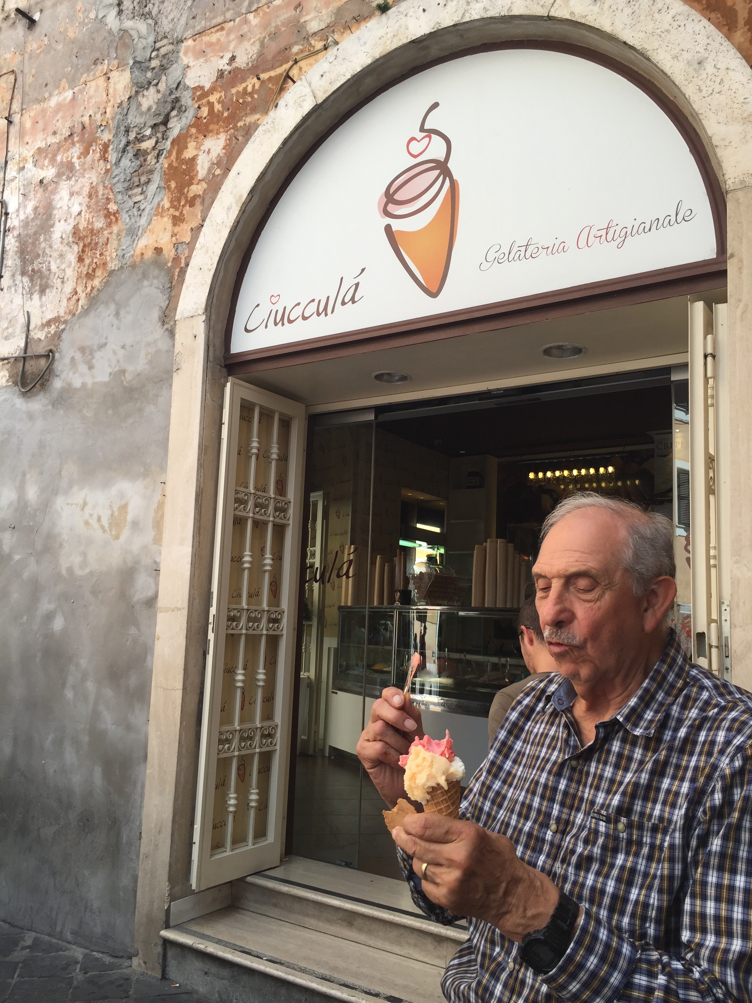 Then dinner. We did use the phone GPS to guide us to Restaurant Il Buco, recommended by our hosts. It was about 1/2 mile away, a long walk. We start every dinner in Italy with bruschetta whether it’s on the menu or not. We followed twith veal with mushroom sauce for Joe and veal piccata for me. As usual, a little ice cream for Joe. After our memory lane tour and all that walking we were exhausted, as usual, and returned to our “Navona Sweet Home” apartment for what I hoped would be a good sleep. The mattress is one of those foam things that conforms to your body. It was kind of wierd. Tomorrow’s a big day with our special visit to the Vatican. Tell you later.