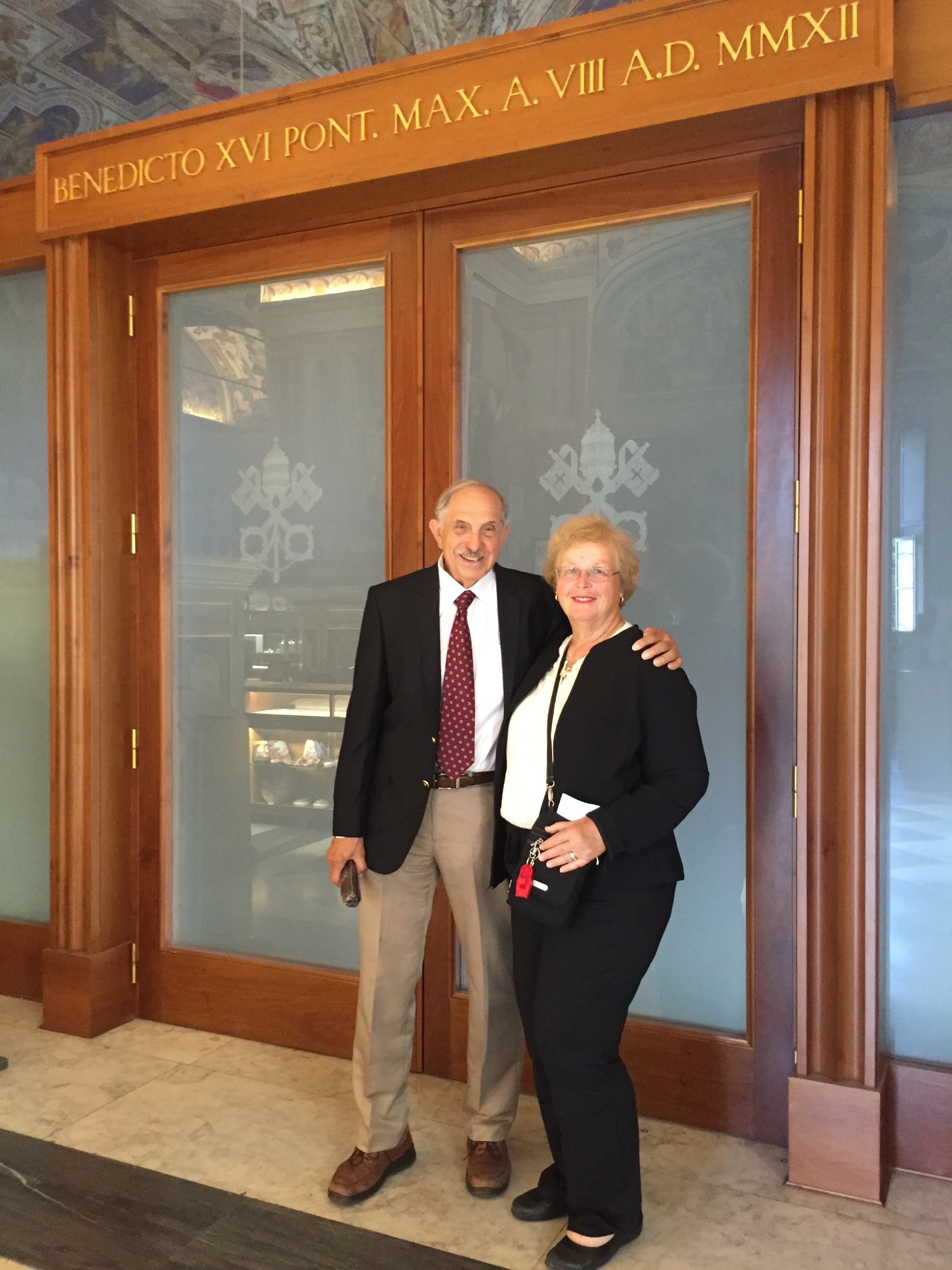 We were able to go on this special tour because we joined a group called the Patrons of the Arts of the Vatican. Their mission is to restore or preserve the works of art that are in the Vatican including maps, sculpture and paintings and even whole rooms. There was an exhibit coming to the Ronald Reagan Library called “The Splendors of the Vatican”. It turns out that the Patrons were the ones sponsoring the exhibit. At a gathering of American Pilgrims on the Camino, we were having a conversation with a fellow pilgrim and the subject of the Vatican exhibit came up. She told us about the Patrons and explained that there was to be a special opening of the exhibit with a dinner and private tour. She said the Patrons have other events in California related to Vatican history and also offer a special tour of the Vatican museum to Patrons visiting Rome. I knew we had a trip coming up and I’ve always wanted to see the Sistine Chapel without having to fight for space or have a guard yelling to the crowd to be quiet. And we were already planning on going to the exhibit. So we joined the Patrons.