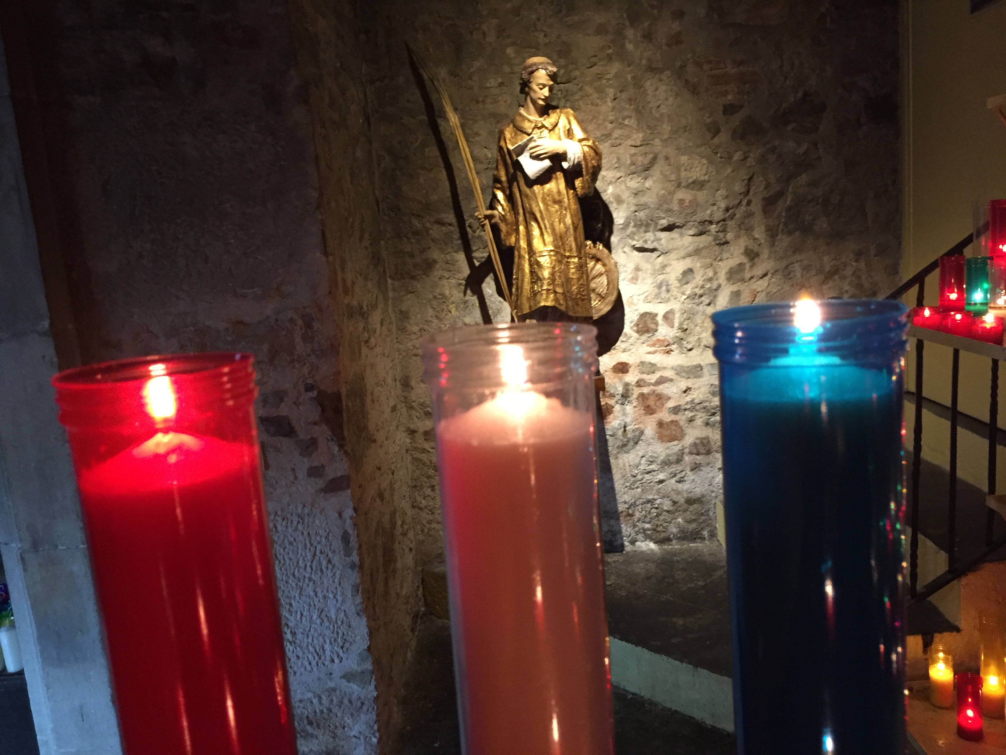Soon we were in the gardens. I had no idea of the scale of the property. The gardens are huge and contain many beautiful structures including the monastery where Pope emeritus Benedict lives, small villas, the Vatican radio offices, and many more. There is also a lovely grotto of Our Lady of Lourdes with the original altar. When we finished our official tour, Simona escorted us into St. Peter’s, again through back passages and walkways. One special room Joe wants me to mention contained sarcophagus (the plural) and burial urns and monuments dating back over 2000 years. After the peace and quiet of our tour, St. Peter’s was a circus with hordes of people wandering everywhere, with selfie-sticks and video cameras pointed at themselves more often than anything else. Some appeared to know they were in a holy place, but most just gawked and snapped and moved on. We stopped in the chapel of the Blessed Sacrament to reflect on our many blessings and to pray for ourselves and our friends and family, especially those who are very ill. One bright moment was meeting a jolly priest from Savannah, Georgia, who kindly took our picture. (Ok, I might have gawked a little, too ) Reluctantly we left, only to find ourselves in the rain. So we found a taxi and headed home for lunch and a siesta. Later we walked over to the Trevi fountain where we tossed in a coin in hopes of returning. I had hoped for a nice dinner to finish off our Rome experience and we happened on the perfect restaurant, Il Quirinal. White tablecloths, candle lit, and professional looking waiters. Our waiter, Antonio, struck just the right balance between efficient and friendly. He served us beautifully. Joe’s salmon and my saltimboca( a Roman specialty with strips of pancetta baked on pieces of tender veal) were delicious. Of course we started off with bruschetta. For dessert it will come as no surprise that Joe had ice cream, this time with fresh berries. I had the Tarta Nonna, a custardy concoction with lemon zest. We had vino tinto and paid the extra 2 Euros for bread. Then home for a good sleep. During the night a storm raged, with thunder and pouring rain. I prayed for it to pass for our flight the next day.