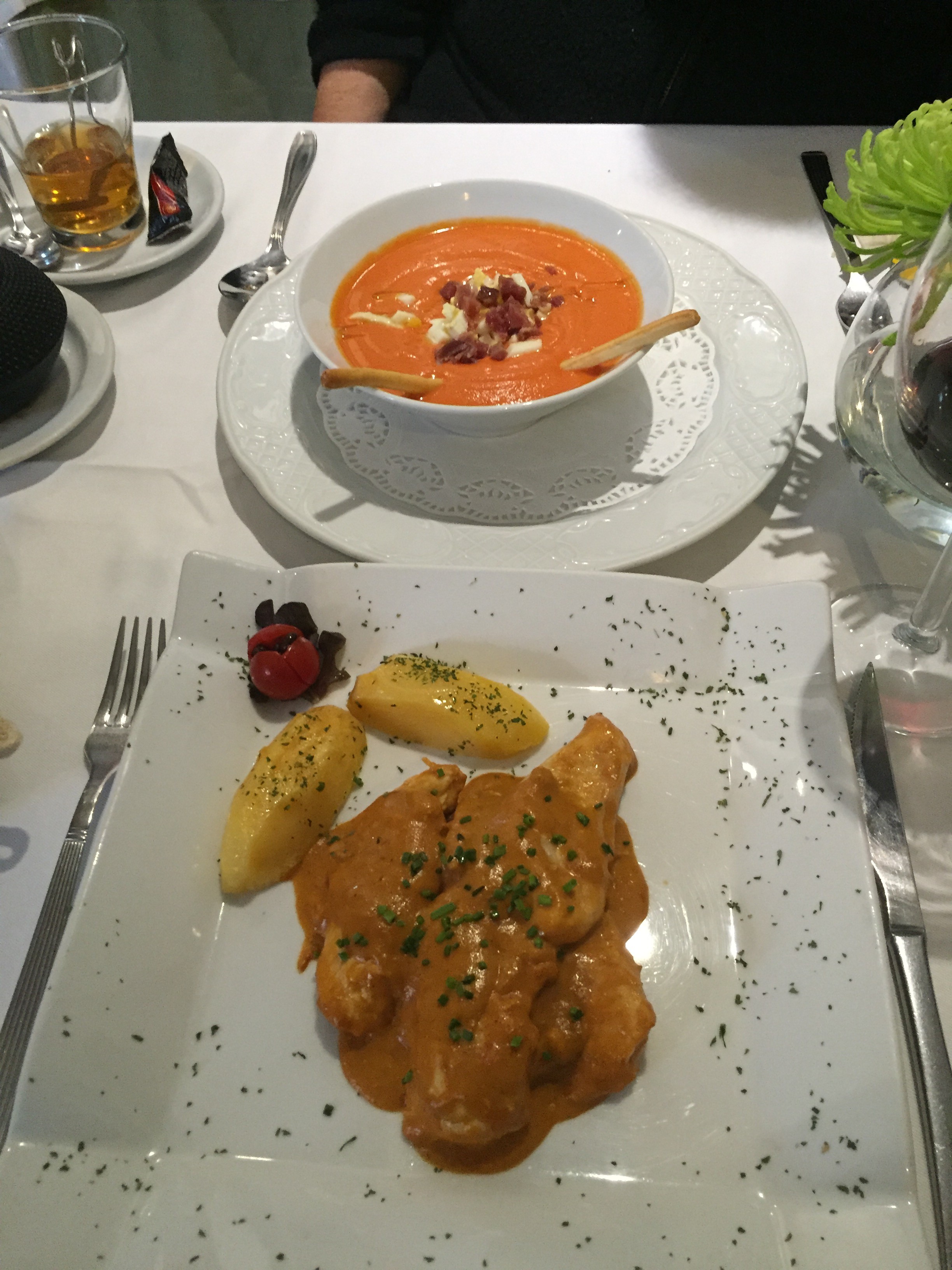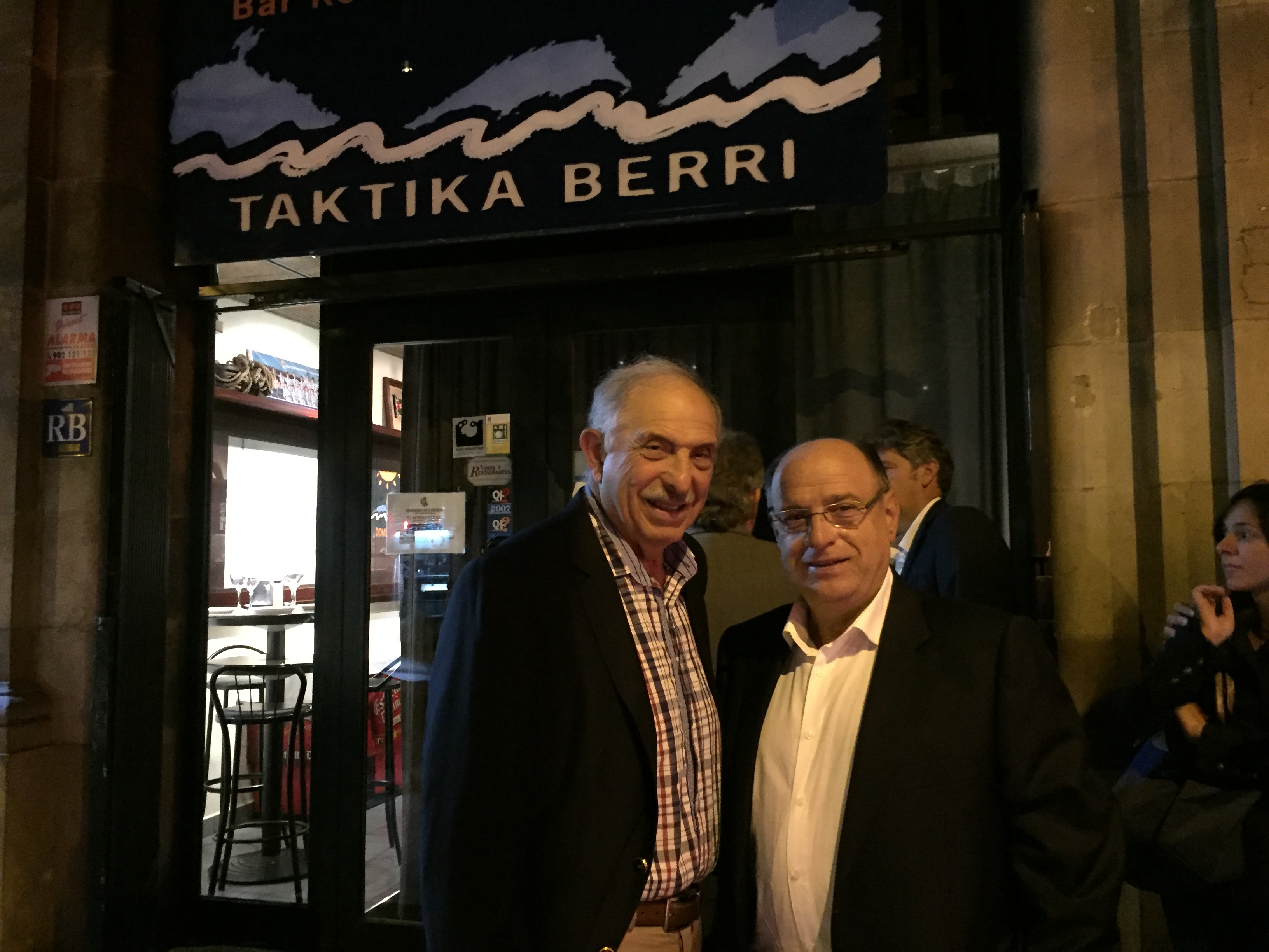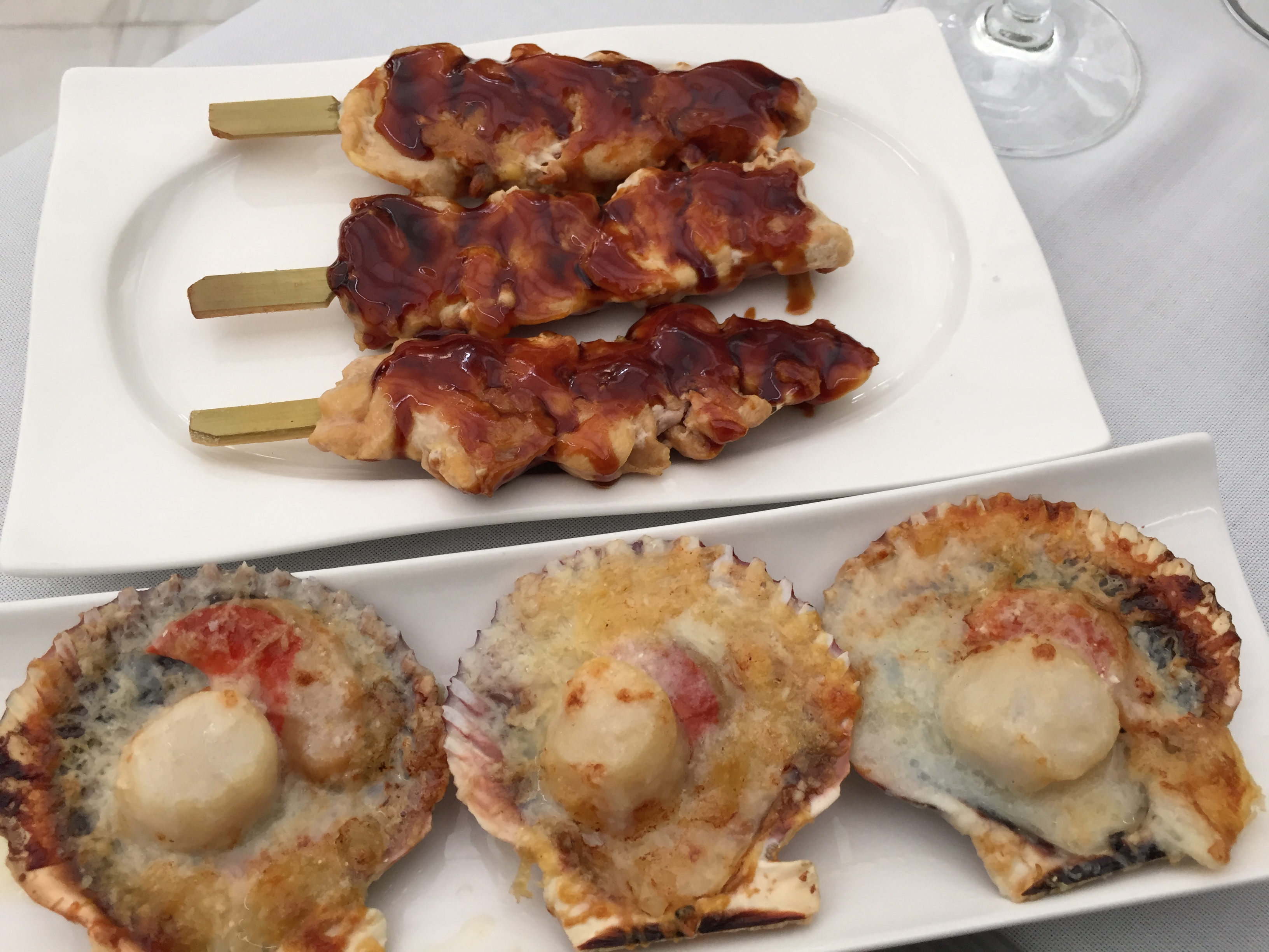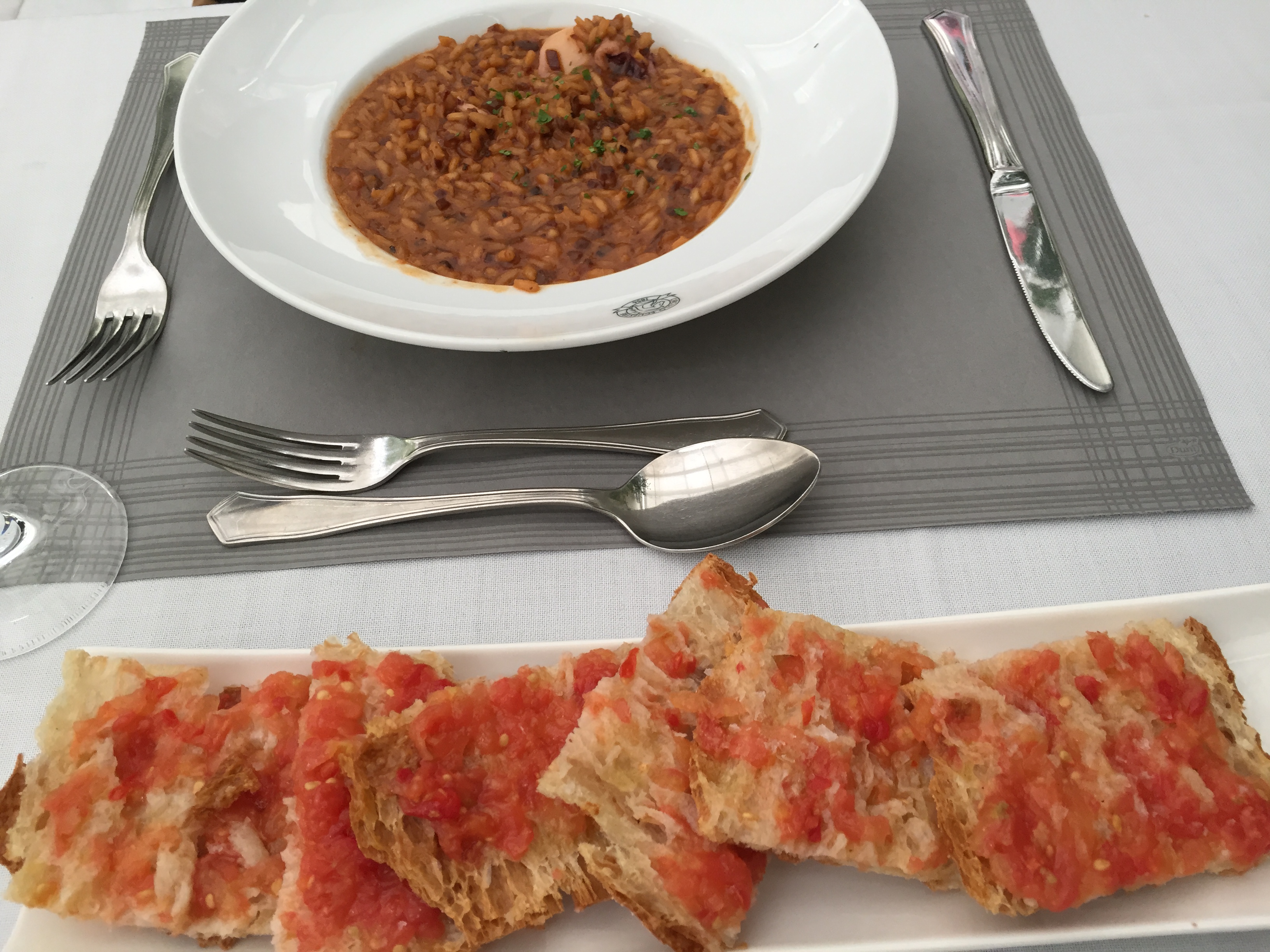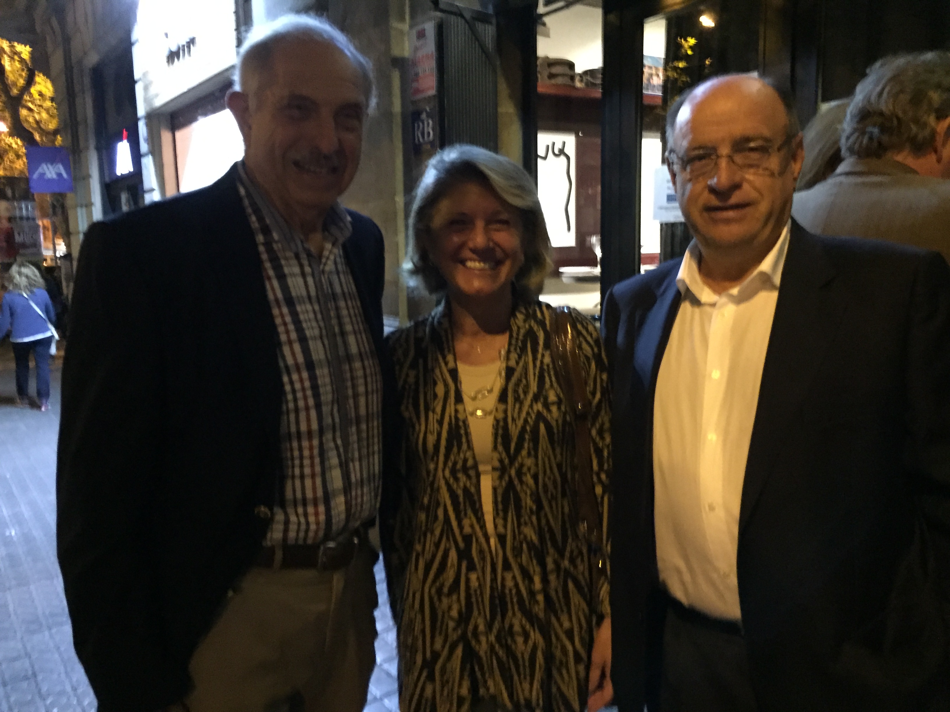 Tossa was the perfect place for us to rest. Now on to the final leg. We gathered our things, packed the car, got the GPS going and we’re off to Barcelona Easy drive ; even finding the car return was easy because we’ve done it before at the train station. Next thing was to buy a train ticker for tomorrow to Madrid Easy, peasy. Then taxi to our comfortable familiar hotel at the Circulo Equestre where we were warmly welcomed and escorted to our spacious double room. Next order was lunch in the Terrace. This is a private club so to go to the restaurant Joe would have to wear coat and tie. The Terrace was fine. Joe had the arroz of the day (risotto calamari) and I had assorted tapas. I chose small scallops, chicken skewers teriyaki and bread with tomato spread (traditional Catalan). Then we retired for a little nap, 3 hours long! We were invited to join Manolo Banales and his lady, Monsy, for Basque tapas at the special restaurant we went to with them 3 years ago, Taktica Berri. This time he arranged for a table, so no standing at the bar. The wine, tapas, and conversation flowed with lots of laughs in spite of my limited Spanish. The waiter brought us plate after plate of deliciousness. I even tried the sausage and the smoked salmon. I drew the line at morcillo, a blood sausage which Joe downed with gusto. We took a taxi back and Joe is already asleep as I finish this entry .