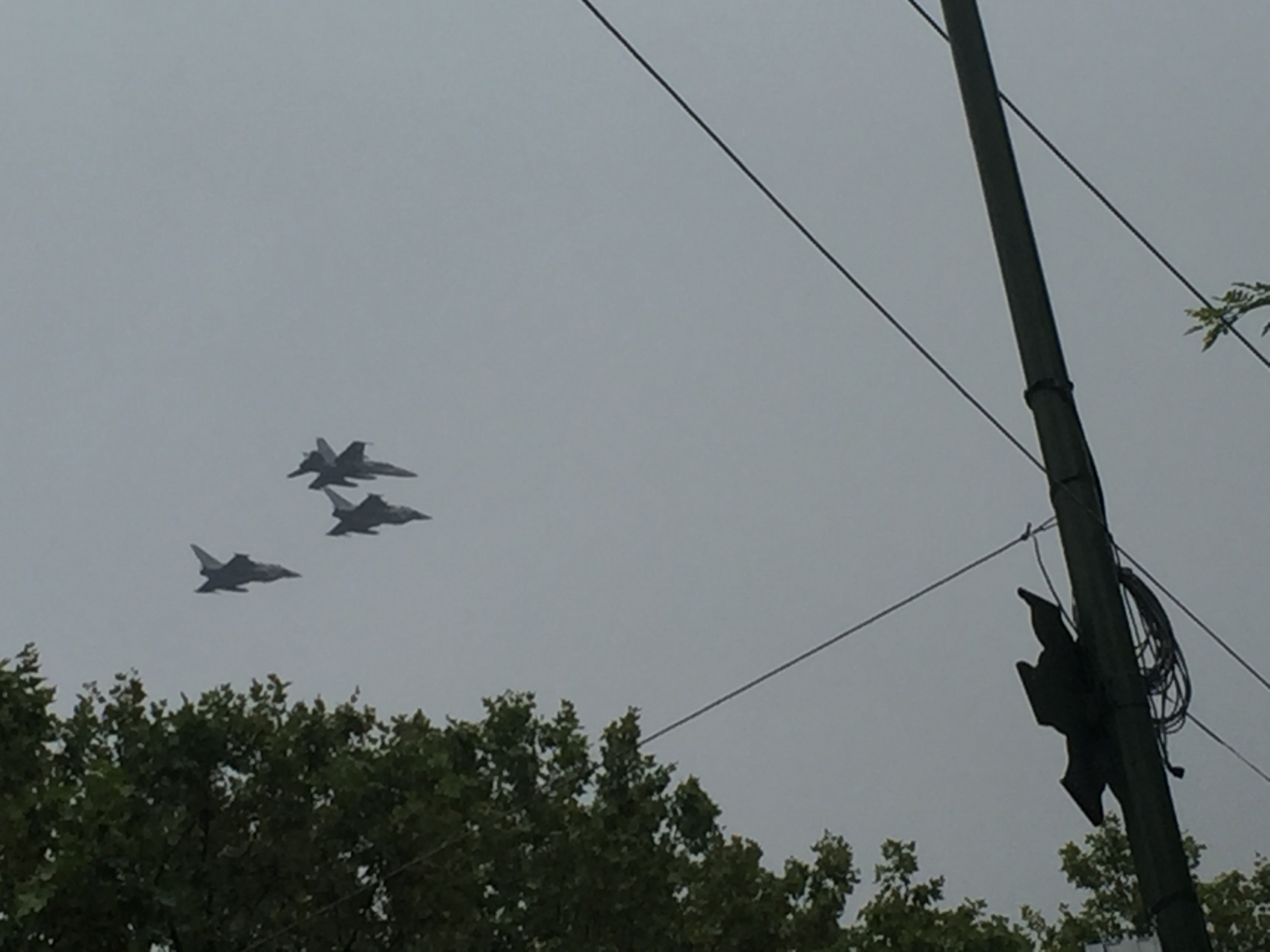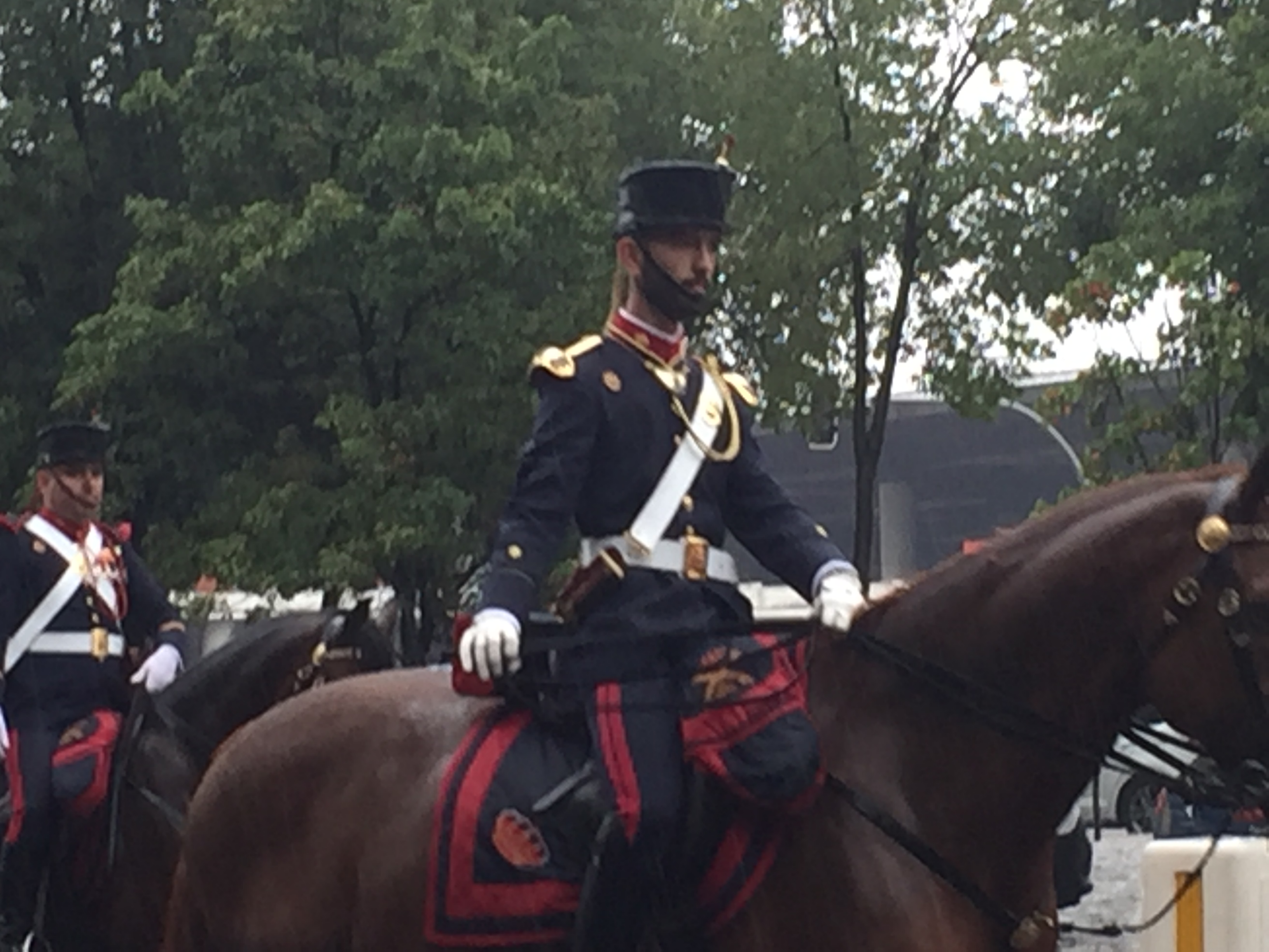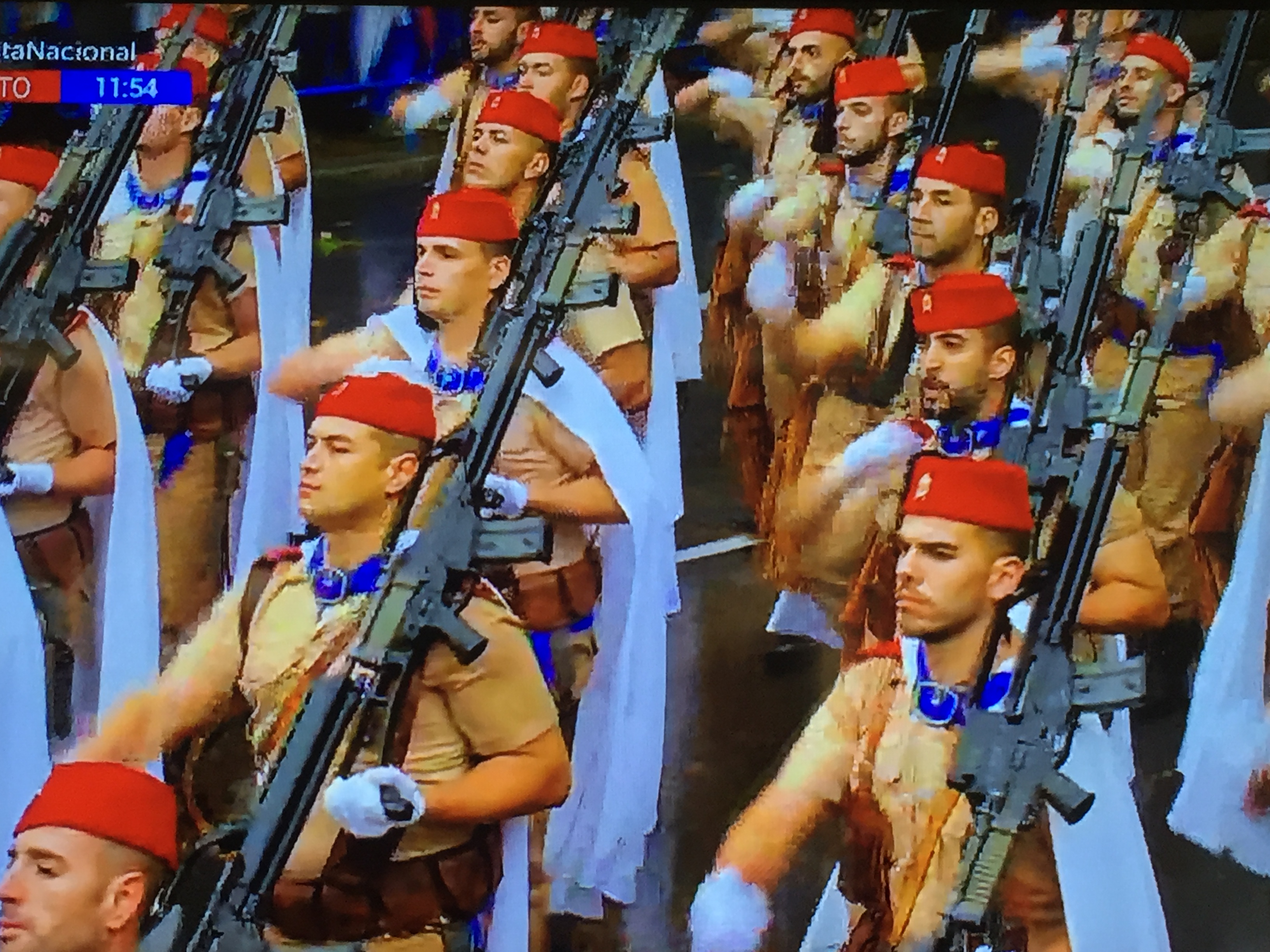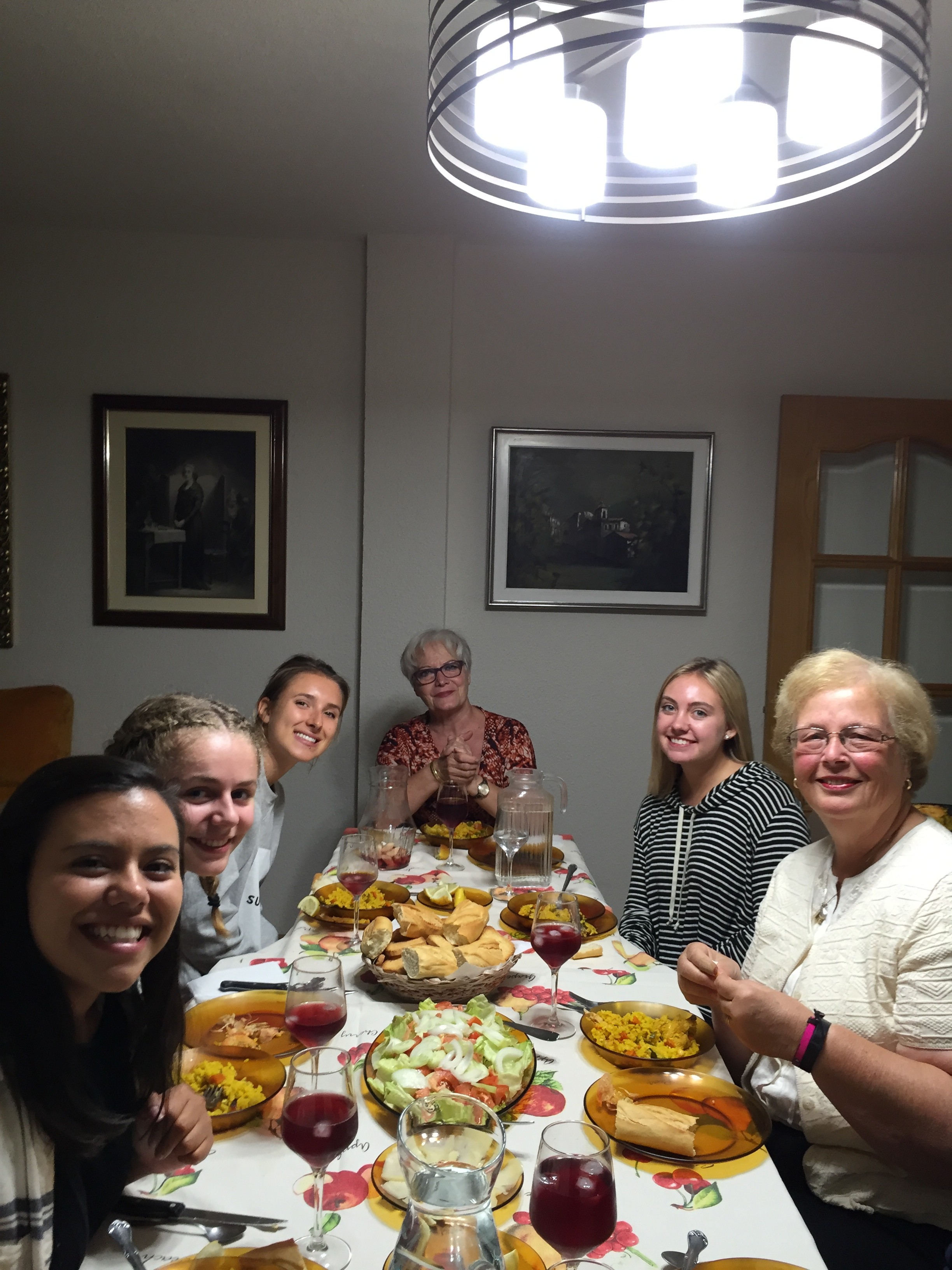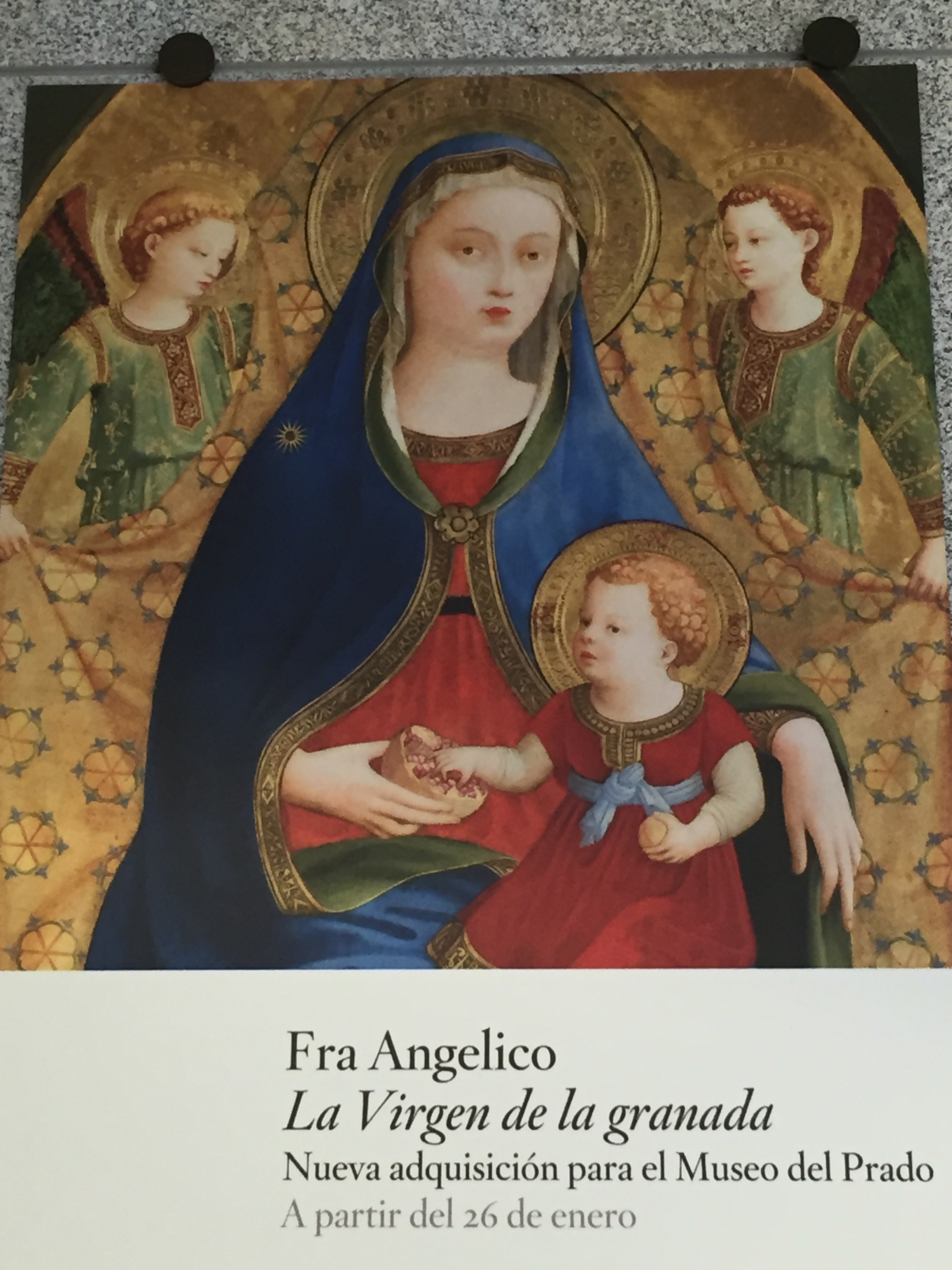 This was a good day in spite of the unrelenting drizzle. In some parts of Spain, particularly Zaragoza, Oct. 12 is the feast of Our Lady of Pilar. They have a huge fiesta and adorn the outside of the Church with floral designs topped by a tiny statue of Our Lady. But in much of Spain, this was Columbus Day, a national day to honor the military. Here in Madrid there was a huge parade of soldiers of various regiments, bands, and cavalry marching in front of a reviewing stand where the king and his family as well dignitaries from all over Spain were gathered. The king and his wife are an extremely handsome couple and their two little girls were so cute and so well-behaved. The regiments were from all branches of the service. Some were infantry or paratroopers in their fatigues; others were all spit and polish in dress uniforms, some wearing many medals. One unit wore capes and fezzes and looked like the Foreign Legion. The cavalry units were forming right in front of our hotel! We dashed out, umbrellas in hand, to see what we could see. Mainly what we could see was a sea of umbrellas. Joe gave up and went to watch it on TV. I hung in there for a while and saw the fly-overs. Three sets of jets went roaring by, one set let off a vapor trail in the colors of Spain, red and gold. Then I was getting a bit soggy and went back to see it on television. After all that excitement, we decided to go to the Prado which is very near our hotel. All the museums were free of charge on this holiday. Katherine had told us of the Bosch exhibit and there were many other masters we hadn’t seen in a long time. We should have expected what we found which was a huge queue that snaked for what looked like blocks of people patiently waiting in the rain. Standing in line waiting is not our favorite thing to do so we decided to have lunch first and then reassess. We found a charming cafe, the Cafe Botanico, across the street, and had a good meal of soup for me and chicken with a delicious sauce for Joe. I had a pot of tea to warm me up while Joe chose a nice glass of rioja. Then we went back to the Prado. By now the line was much shorter. It wasn’t long before we were handed our free tickets. The Prado isn’t huge so it was fairly easy to find the masters we particularly enjoy such as Velazquez, Murillo, and Goya. Two men offered us their audioguides as they were leaving and didn’t need them anymore. I love random acts of kindness. The guides were quite helpful in explaining the Bosch tryptics. His fantastic interpretations of good and evil, heaven and hell, were very obscure without explanation. After a while we were both getting tired. I knew there was a Fra Angelico in the museum but just couldn’t figure out where it was. As we were looking for the exit, we went into a room and lo and behold, there was Fra Angelico’s Annunciation in all its glory. As a bonus there was also Virgin and Child with Pomegranate. My eyes were so happy! After gazing at them for a little while from a comfortable bench, we left. It was already 5:30 and we had a dinner date with Katherine at her apartment. We arrived promptly at 8:30 pm and were greeted warmly by her host mom, Dama. I brought her a little gift of candy from the hotel. The table was colorfully set for 8 with platters of salad, slices of semi-soft Manchego cheese, a basket of rolls. Dama brought out pitchers of sangria and water. And then the masterpiece – shrimp and chicken paella! What a feast! Dama professes to speak no English so the lively conversation was rather bilingual. Katherine’s roommates are all charming, quite different from one another, and obviously good friends with one another. We had a great time and were sad to leave. After hugs all around, we went out to find a taxi which took some doing. Katherine saw us off and we went home to bed, exhausted but very satisfied with the day.