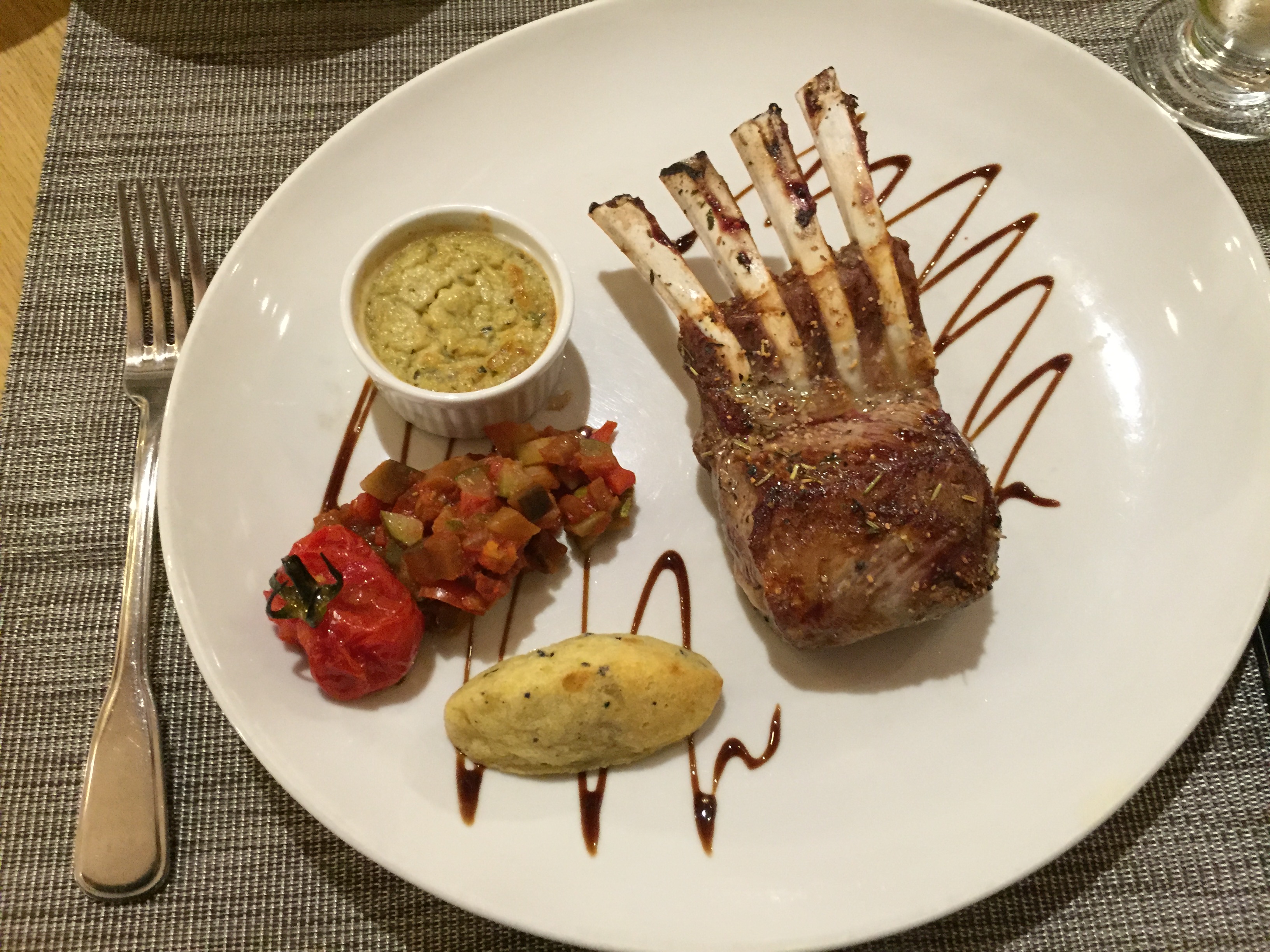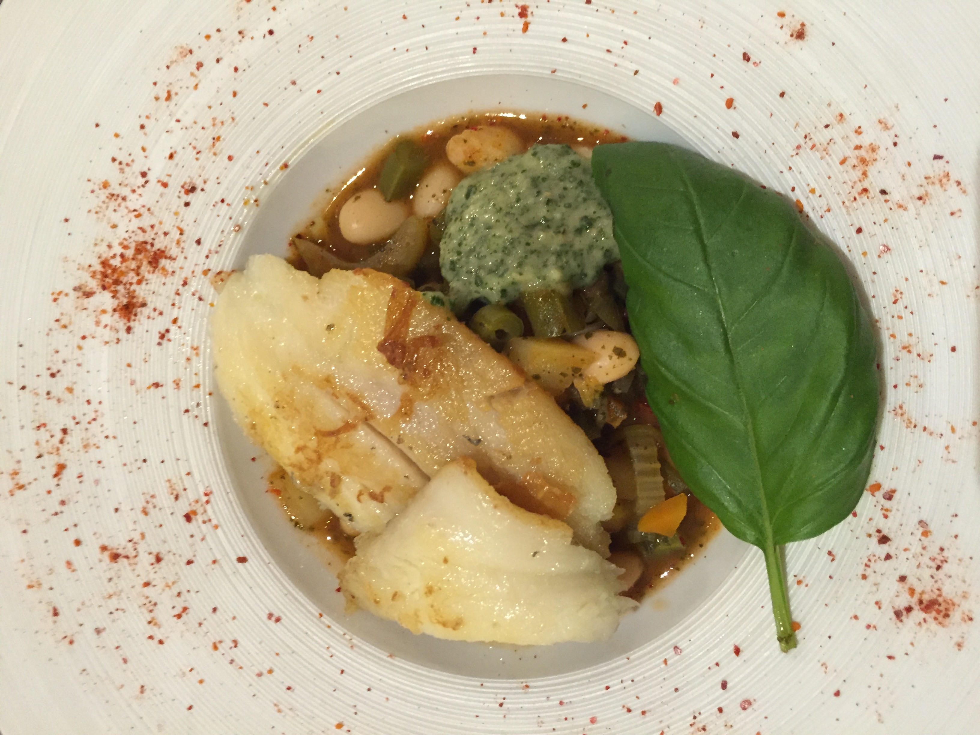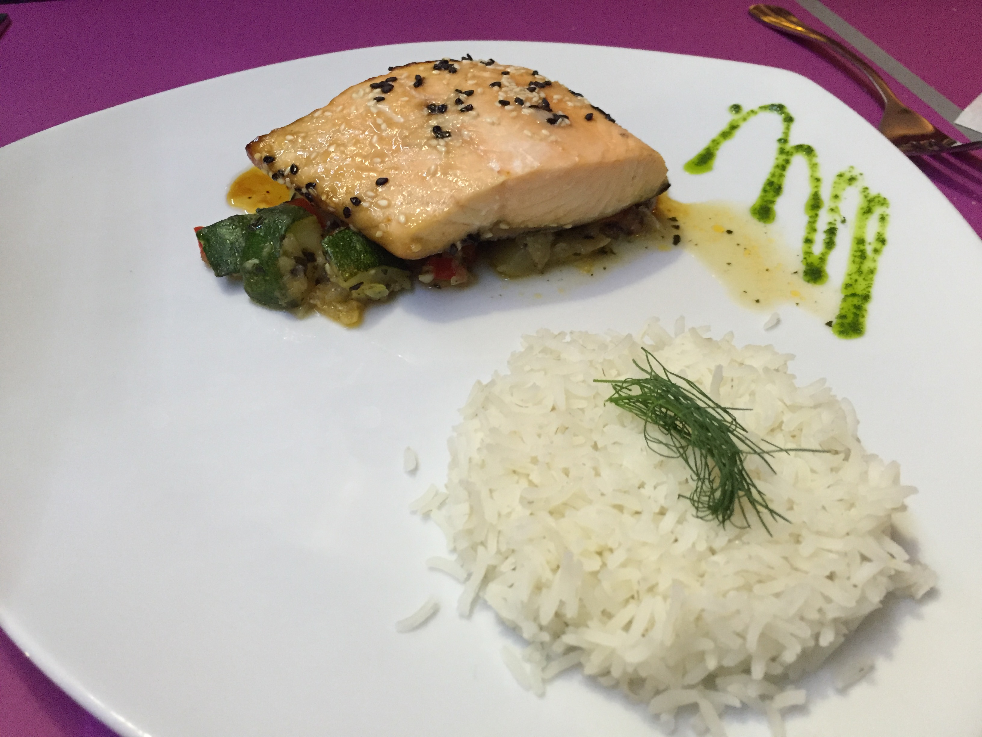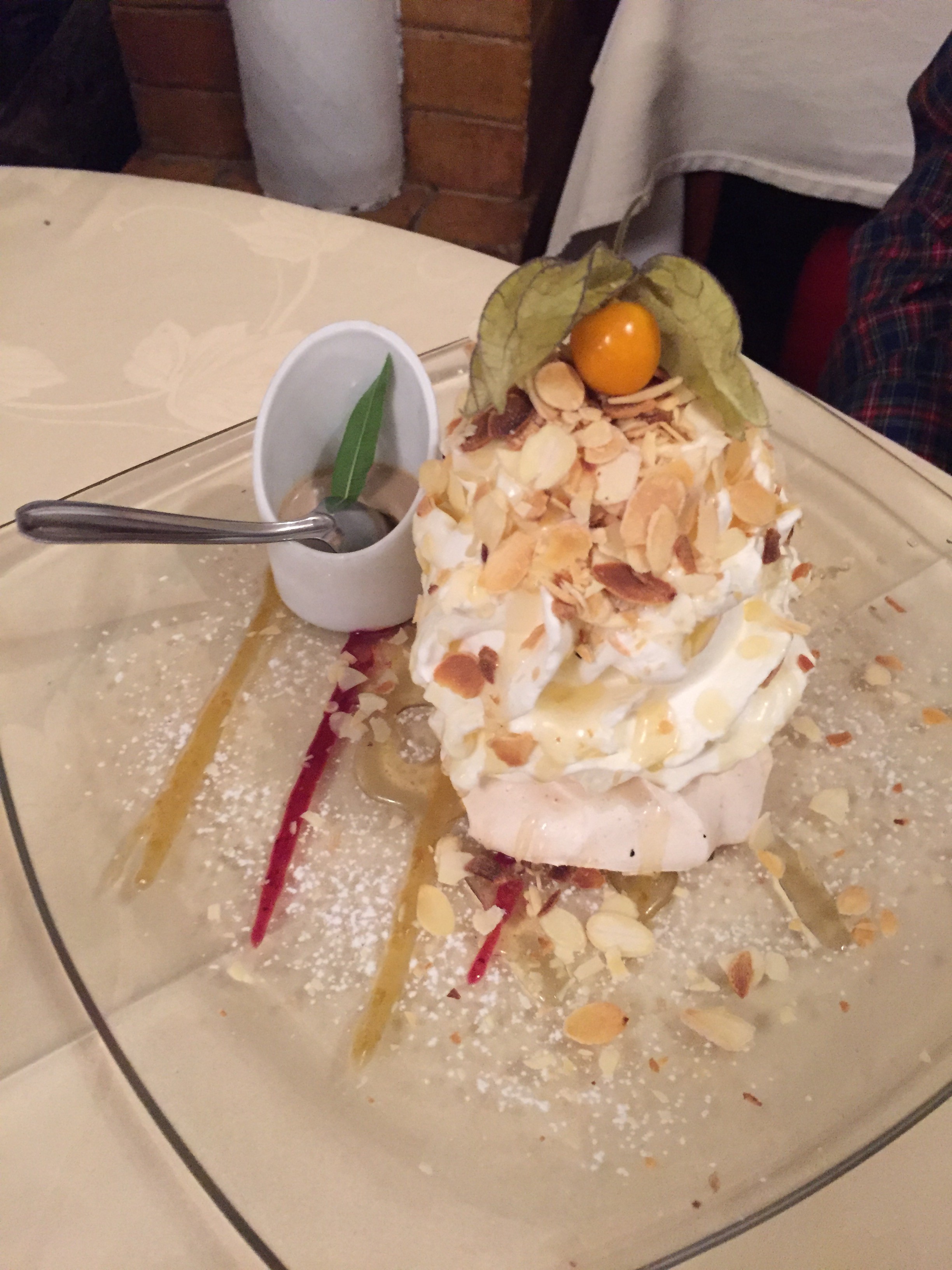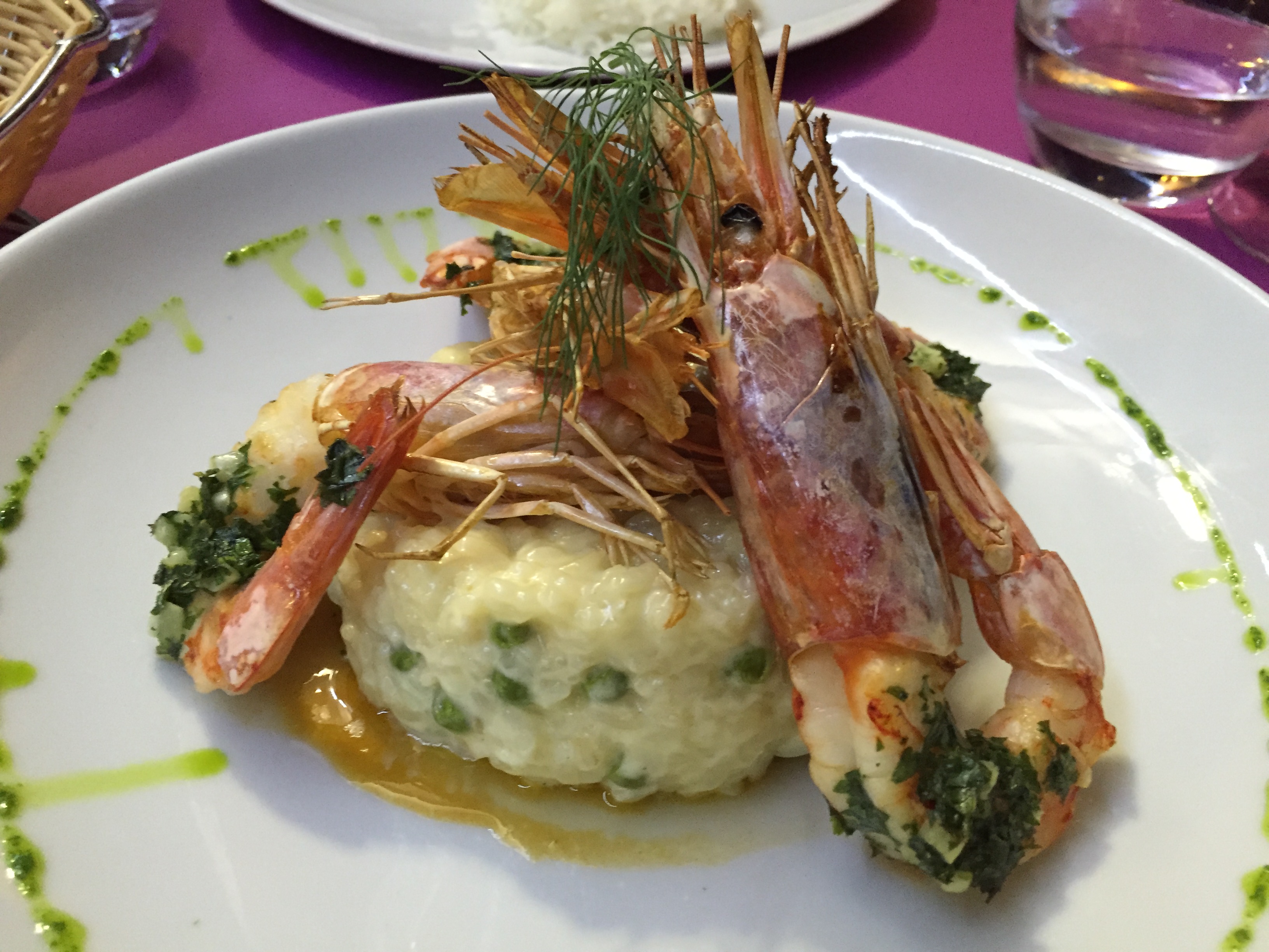 The good French lunch didn’t happen. It took forever to get our rental car, mostly due to the poor English of the agent and also the unwillingness of her boss to give her a hand to make our lives easier. In any case, we were finally on our way and I just wanted to get to Crestet and it was going to take an hour and 1/2. We stopped in some little town along the way to get cash so we can pay the damage deposit and while Joe was at the ATM I found a little grocery store that sold Emmental (a delicate Swiss cheese), some bread, some mustard and some water. I also got Joe a hm and cheese sandwich. We finally arrived at our destination and none too soon. We were greeted so warmly by Monique, Winnie, and Paul. I felt like we had come home. We arranged to meet at 6 for a glass of wine and a chat before they had to leave for an engagement. The rest of this blog will be about food. We are definitely in France. We went to a local eatery, Epicurian. We were one of two customers so had excellent service. The photos should speak for themselves Gazpacho with tomato/basil sorbet (soooo good), Salmon glazed with honey on top of vegetable medley and a side of rice for Joe; risotto with peas surrounded by grilled prawns for me; and a shared dessert of raspberry and peach trifle with macadamia vanilla ice cream for dessert. All accompanied by a pichet (50ccs) of house red wine. Ooh la la, we are in France!