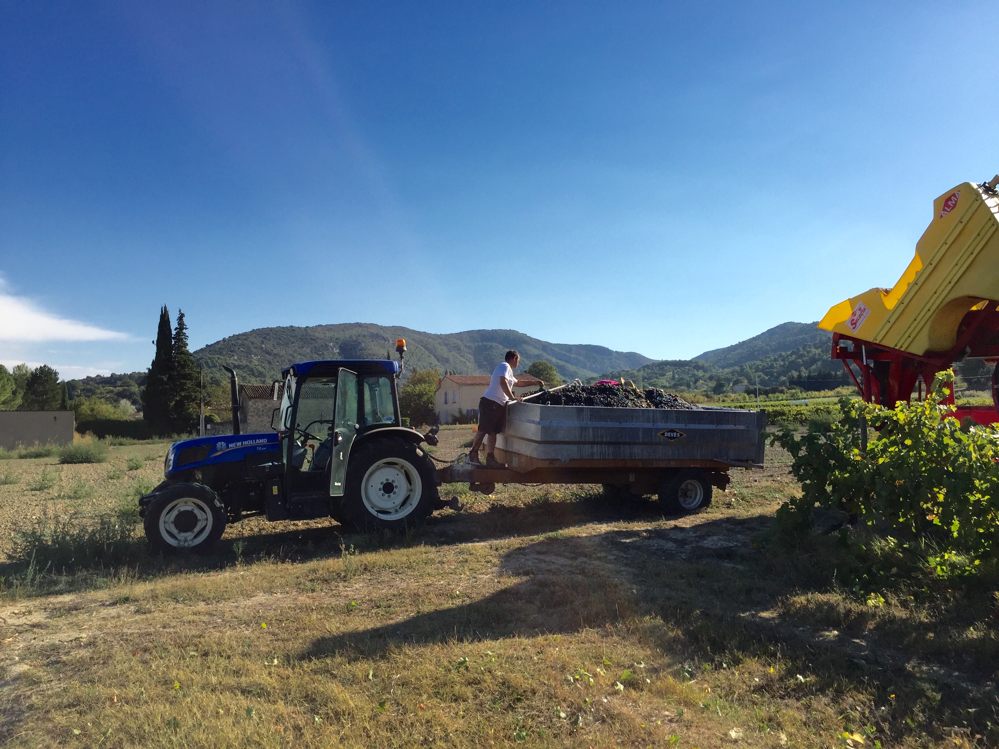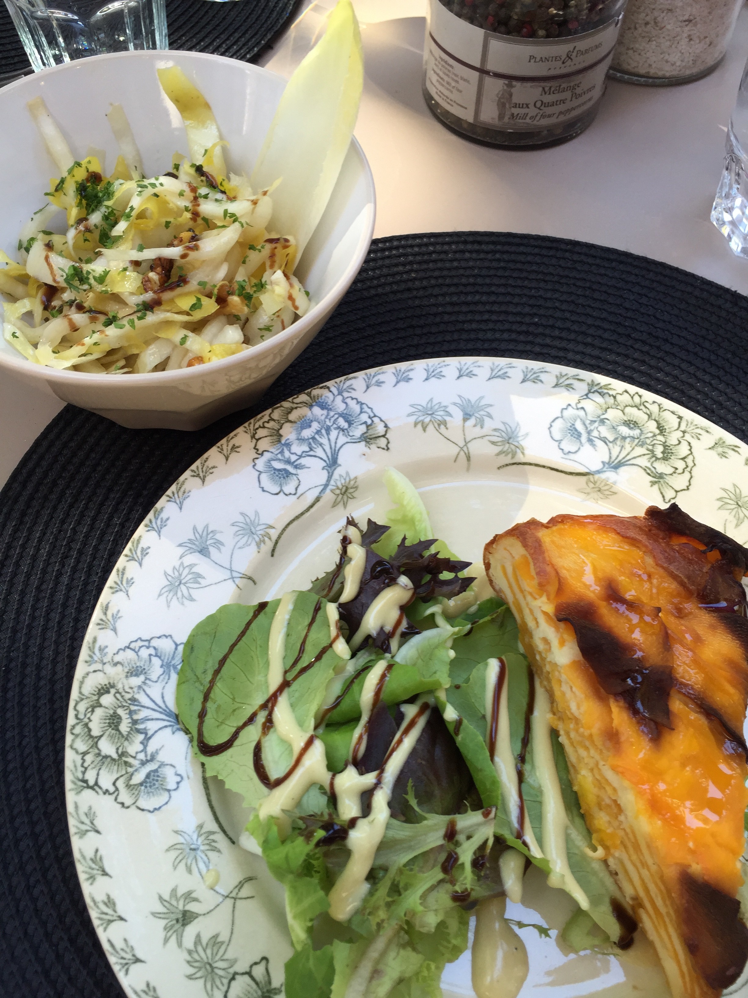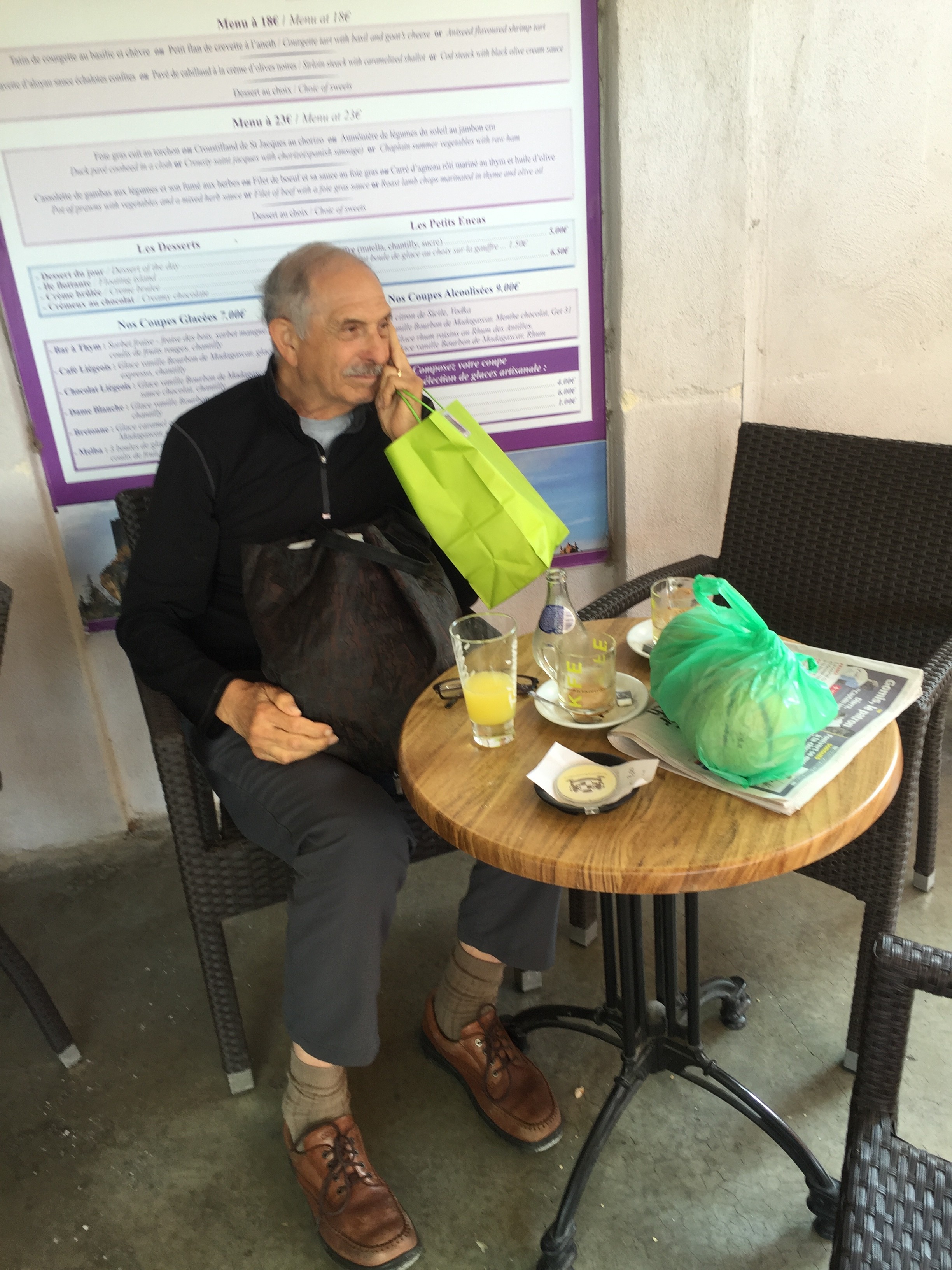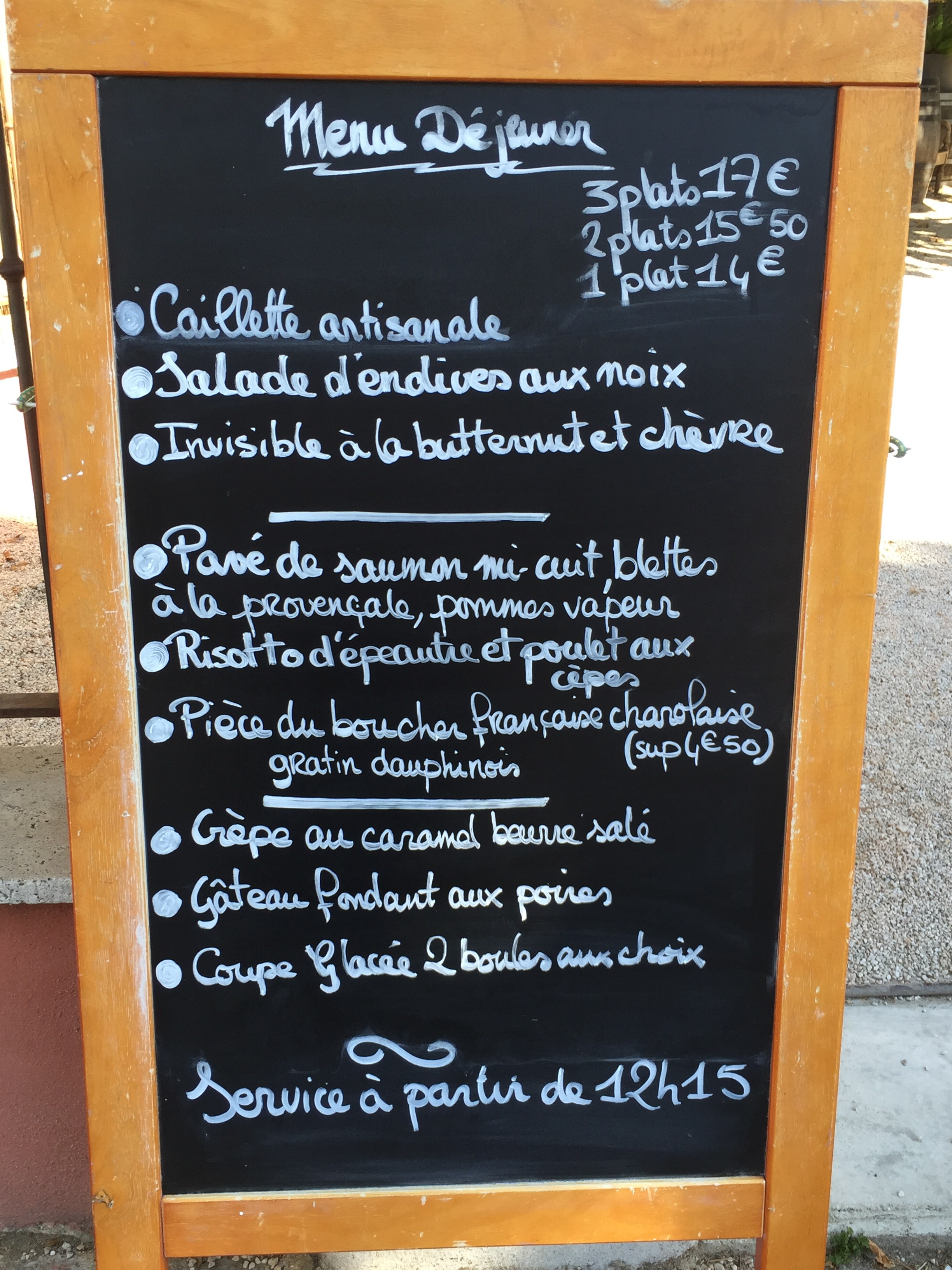 as they worked from row to row, gathering grapes and then dumping them into the trailer for transport to the local wine cooperative. I learned that they are mainly Grenache grapes. I got a good video. Then Joe went to the store for some essentials so I could prepare breakfast. You must understand that this was a momentous event in Joe’s French experience. He never goes shopping alone except to buy a croissant from the local bakery. I was very proud of him. I made a delicious breakfast. It wasn’t exactly an omelette because it stuck to the pan so it was more of a scramble with fresh sautéed onion, zucchini, and tomato, topped by a little cheese. This was accompanied by slices of juicy melon, fresh croissants, and a garnish of grapes from the field. Then we realized we have a luncheon date with Winney for 12:30. Fortunately, the French do not serve large portions, so we’ll be ok. We met Winney at noon and she navigated to the town of Carriane where we had lunch at Le Tourne au Verre (which basically means Wine Served by the Glass. Start drooling! Endive salad, and risotto with chicken and mushrooms, followed by apricot and cassis sorbet for Joe; butternut squash and goat cheese tarte, salmon on simmered vegetables and pear tarte for me. All accompanied by a glass of Viognier and followed by coffee or tea. The atmosphere of the cafe was so relaxed. We had a good discussion with Winney on the candidates for election in the US and France. No good choices anywhere. The server wanted to practice his English and I wanted to practice my French. And so we did. I explained that I was taking photos of the food for my blog and he wanted the link.