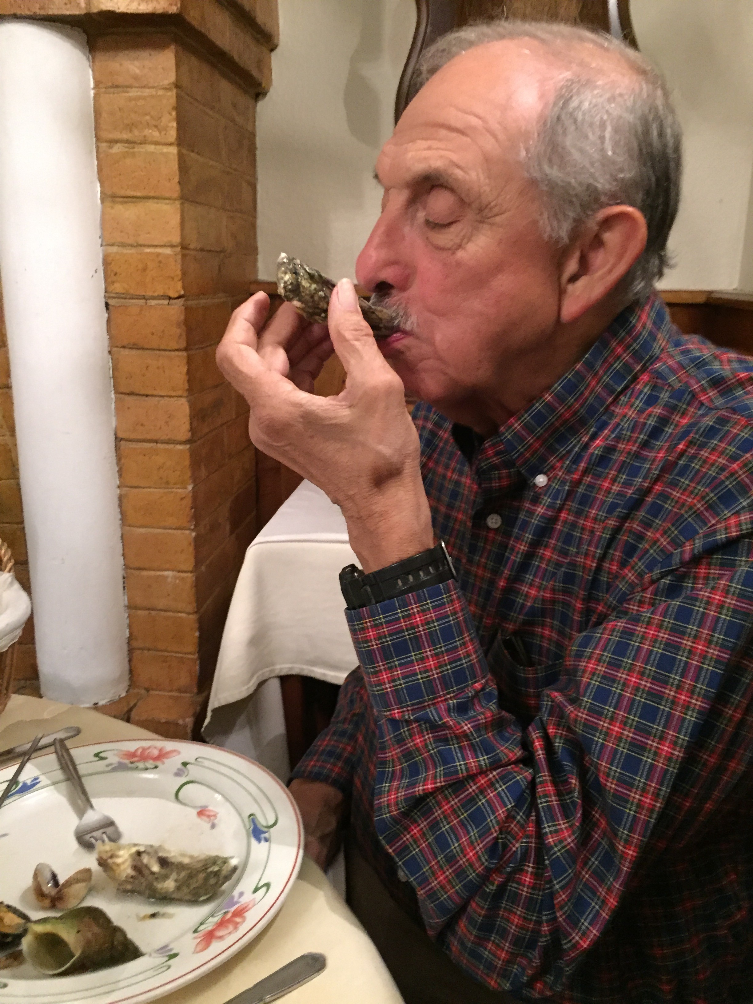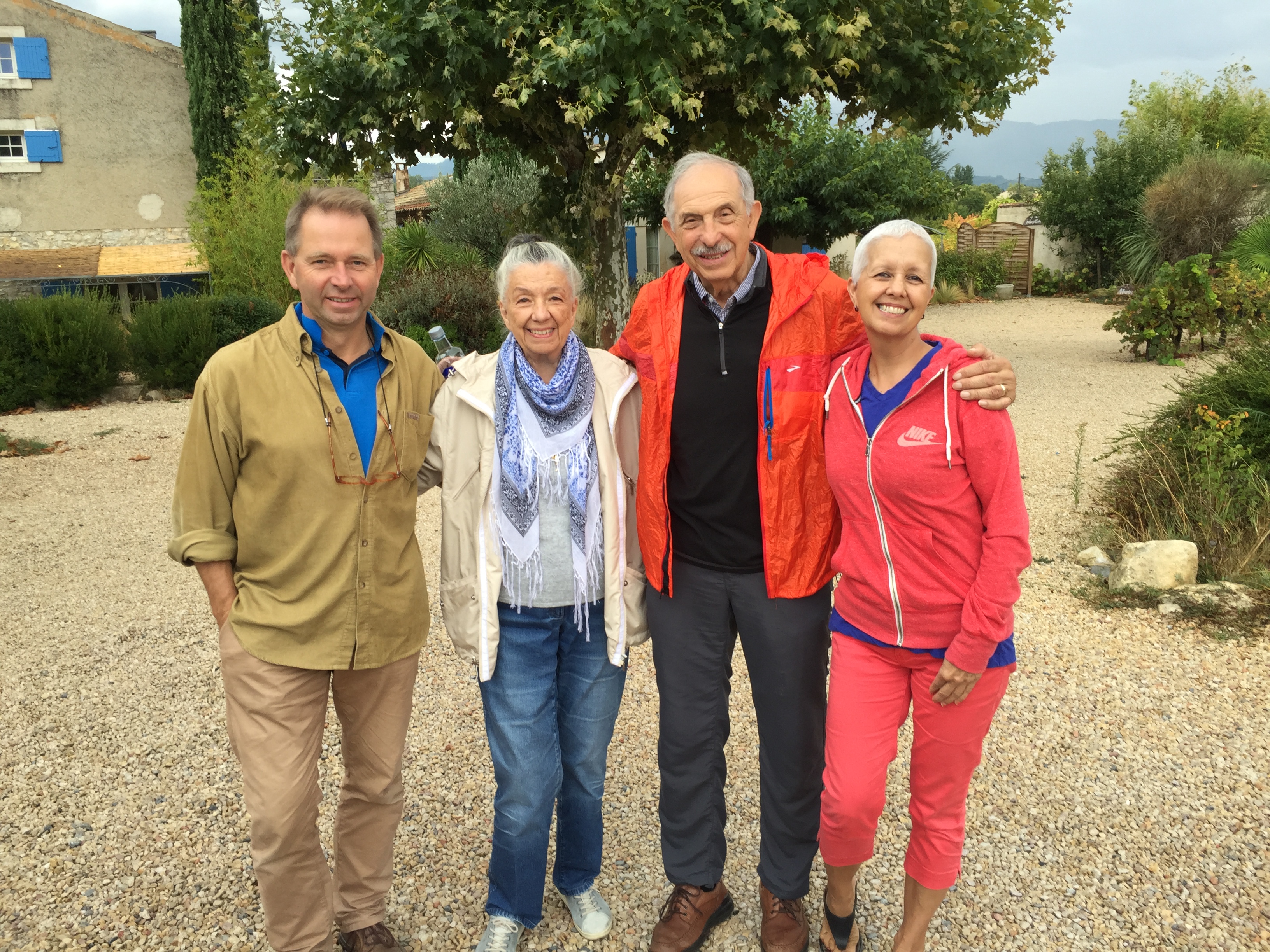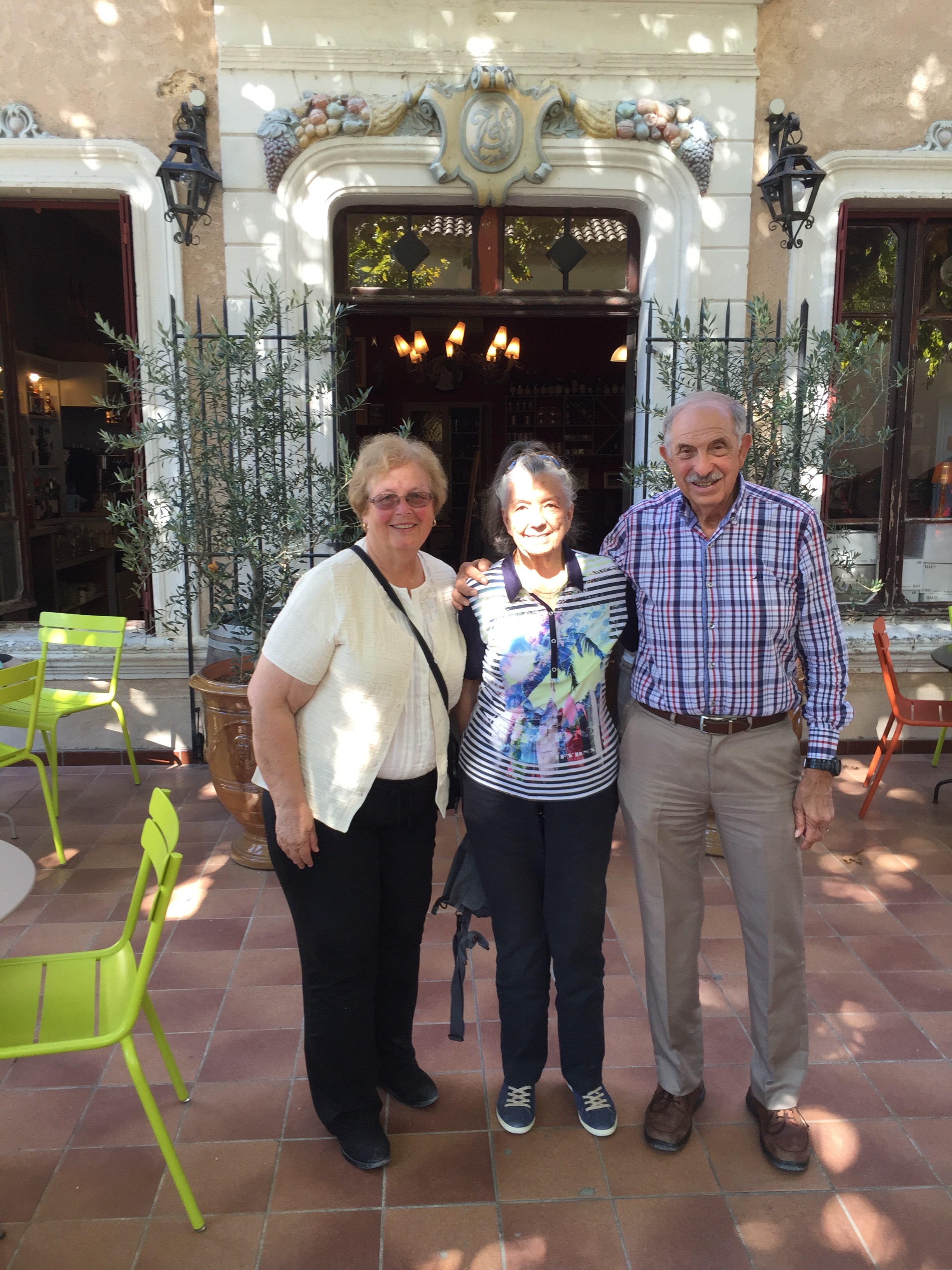 In Brantes we went to the atelier (studio) of a Santon maker, only to learn that she was closed for the day. But we realized we’d been there before some years ago. The village clings to the hillside almost daring you to find the hidden shops and cafes. We moved on to Seau which is were we met a family a long time ago who were vacationing in this heart of lavender production. As we exchanged the usual, “Where are you from?”, it turned out their son and daughter in law had lived on our street in South Pasadena. So we had some lunch there overlooking more lavender fields and remembered that pleasant exchange. Then on to Roussillon, of red, red, soil and green, green trees. Memories of the two women we met in Bonnieux the first time we came to Provence and the fun evening we had in an outdoor cafe with the owner playing the accordion and a young woman getting people up to dance while lights twinkled all around the terrace. We came again with Roma and Terry in 2006 to admire the breathtaking scenery, found in only a few areas of Provence. Time for an ice cream cone! Then on to the hilltop village of Gordes, with its moulin (windmill). I love windmills and will drive several miles out of my way to see one. I remember this one as very tall and round and made of stacked stones. And there it was behind a big closed iron gate. What happened? It used to be out in the open. So I barely saw the top of it as we drove by. So finally on to Iles sur la Sorge, a charming town with canals running through it and water wheels at each end of town. It is well known for its antique market. Again, what happened? It didn’t look all that different, and Roma would recognize the little cafes that lined the canals, but there were people everywhere and no parking to be found. So we looked, we remembered, and we headed for home. Following the signs “direction Carpentras” until we were in Carpentras, then “direction Malaucene” till we passed through it, too. Ine will know all these names. In case I didn’t tell you before, Ine is my high school chum whose fault it is that I’m so in love with this area in particular and French in general. It is her family who own the Domaine where we are staying. We whistled or hummed the Marseillese in Terry’s honor because that’s how he responded when learning that Napoleon had planted plane trees to line the roads so his soldiers wouldn’t have to march in the sun. Also, we remembered the little circus we went to in Malaucene where the elephant was kept chained in an adjacent field until show time and where the ticket seller was the same girl standing up astride two horses as she galloped around the ring. So tonight we took Winney to Restaurant St. Hubert. We’ve been there several times before, the most memorable of which was the last time when Winney’s husband, Ben, was alive and we all went to dinner to celebrate my birthday. We had the most incredible dinner and laughed and laughed and laughed. Tonight was to celebrate the good times we all had together. I know it was a little hard for Winney to be exposed to so many memories at once; but they’re good memories, and we all had some good laughs tonight, too. Our food was wonderful, as usual. I won’t bore you with all the details, but just describe Joe’s meal. We all started with an aperitif of Beaume de Venise. He was in the mood for adventure so his first course, after the Amuse Bouche of something tiny and warm and delicious, was a plate of fruits de mer: mussels, oysters, shrimp, other unknown shelled things, which he ate with gusto, followed by a palate cleanser of frozen mark (an alcoholic beverage made from the seeds of grapes), followed by a half lobster flamed with cognac accompanied by vegetables, followed by a selection of cheeses (I made sure he got some really smelly ones; he ate them all!), followed by a towering dessert of merengue cookie, ice cream, smothered in chantilly, dotted with almonds and drizzled with honey. I’m surprised he can still walk. All of this was washed down with a good local white wine. We’ve been home 15 minutes and he’s already asleep. Last day tomorrow. We will go to the local monastery we visited on my birthday one year where they have a beautiful shrine to Our Lady of Guadalupe. Also on the list is to mail another package home (watch out for it, kids) and do one more load of laundry. We’ve been invited to have dinner with Winney, Paul, and Monique so we’re looking forward to that. This was a very long day!