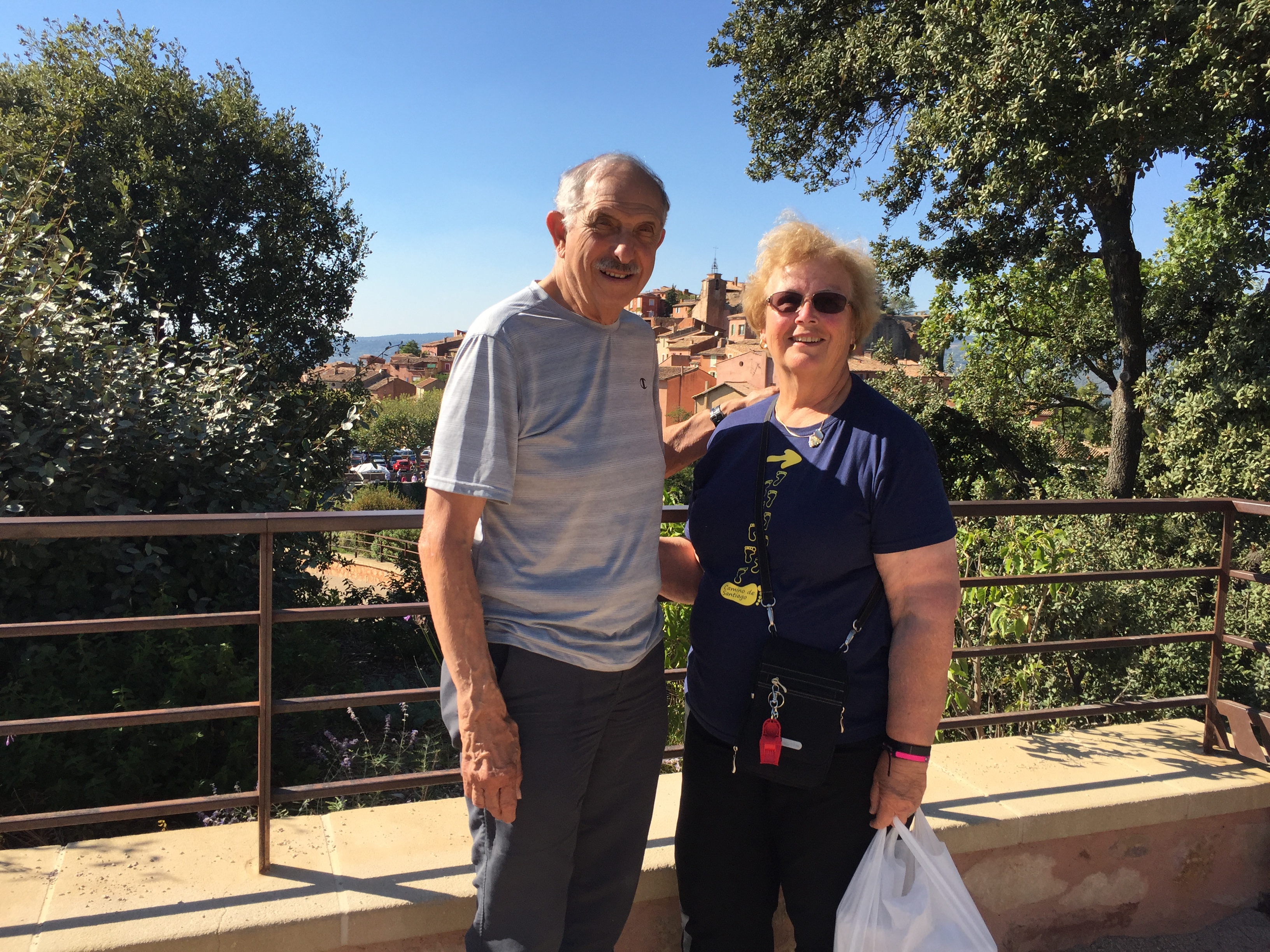 You may not be nostalgic to hear of Brantes, Roussillon, Gordes, Iles sur la Sorgue, Restaurant St. Hubert in Entrechoux; but all of these names mean so much to us – time spent with Roma and Terry, with Ine and Jerry, with Winney, Paul and Monique, and with experiences we’ve had over the past several years. Today we visited all of them. We drove over hill and dale, some roads too narrow for markings, with overlooks into beautiful valleys, with farmlands laid out in neat squares. Some had rolls of hay, some had rows and rows of lavender plants all recently shorn of their glory. Our rental car is a Citroen with very unfamiliar instruments and a push-button gear contraption, and the emergency brake where the gear shift ought to be. With the help of our GPS, Joe has done a heroic driving job.