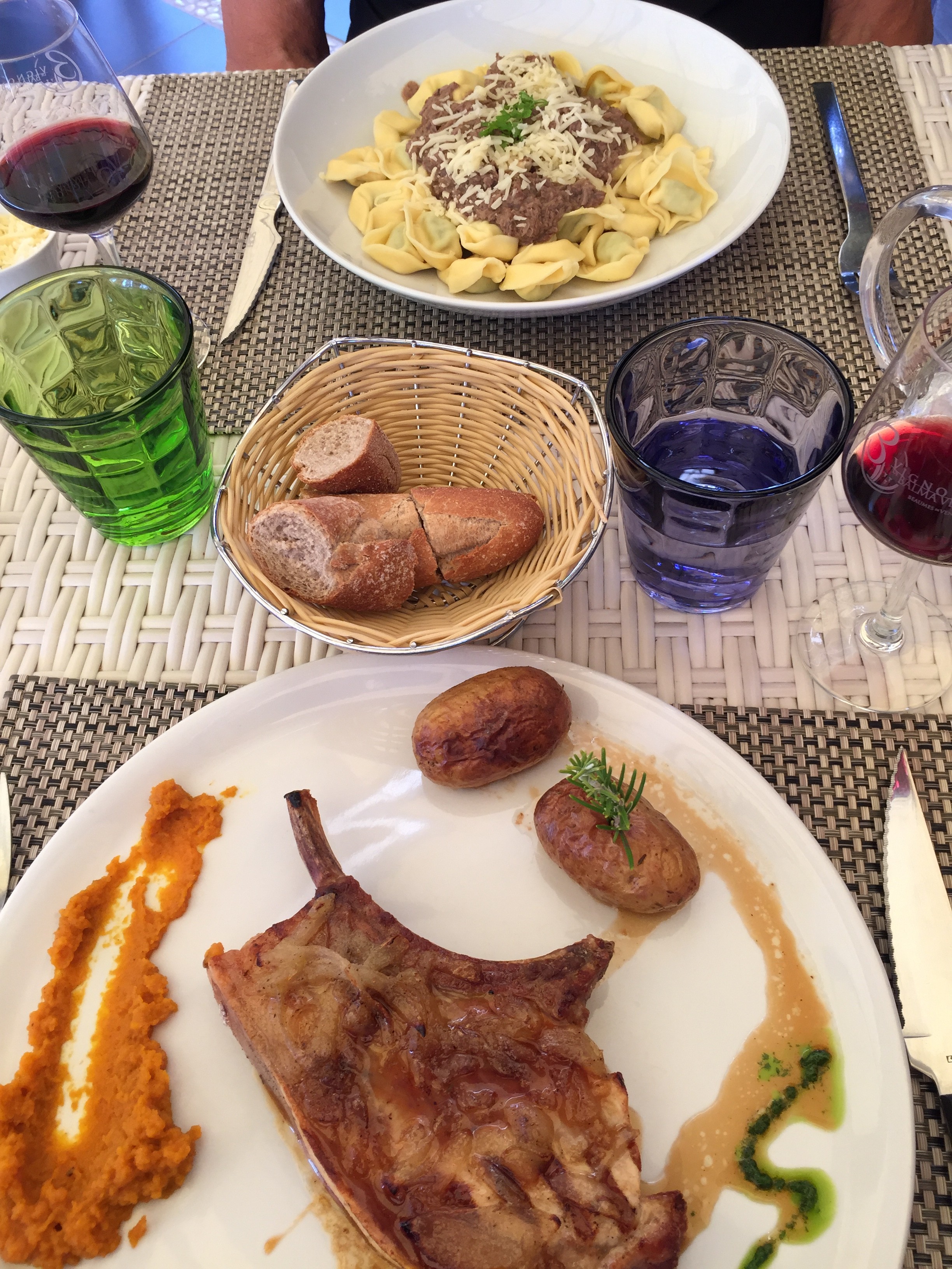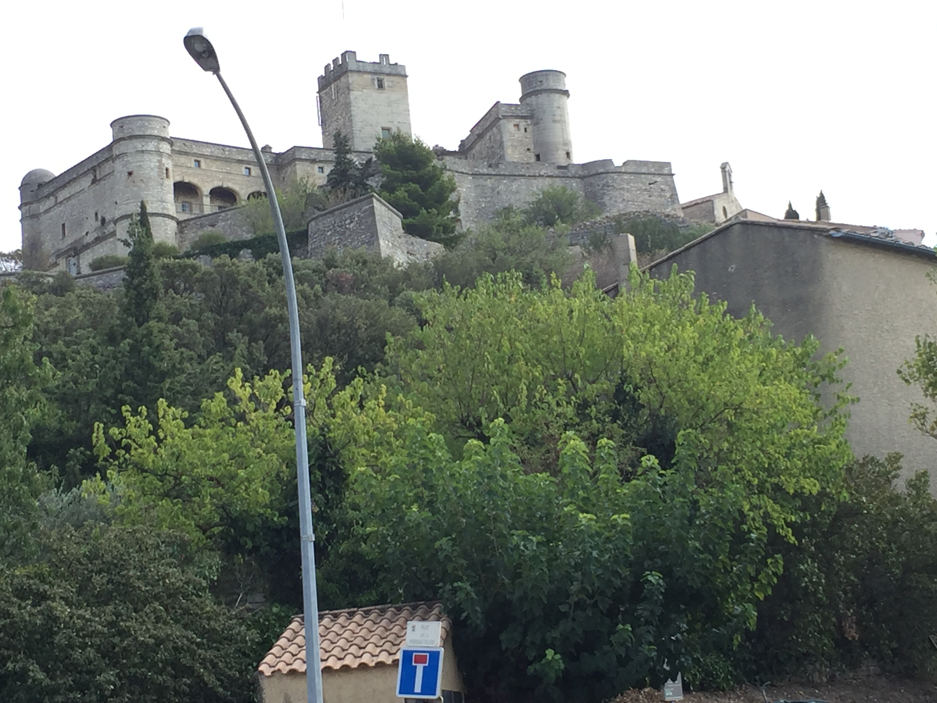 Ok, so I don’t transition well, especially when it comes to saying goodbye to people and places I love. We did a final round of the places we hadn’t seen for a while after mailing yet another box of stuff home. I wandered around looking for some last little thing I needed to keep me connected to this place, but the clothes were too expensive and the stuff was unnecessary. Several things called my name – dish towels, soaps, sachets, aprons, even tablecloths and quilts. But I knew they wouldn’t help ease this sense of loss I feel welling up. So we left Vaison for one more meal at L’Epicurian. I didn’t need to go there. I had the makings of a good salad at home. But I told the guy we’d come for lunch and this was our last opportunity. So Joe had the set menu of salad with two deviled eggs, lettuce, corn, and a piece of chorizo, followed by spinach and ricotta tortellini topped with a meat sauce and finely diced fresh fruit for dessert while I had a pork chop, rustic style which meant the skin was left on the outside to keep it moist, and a green salad. A little wine en pichet and some crusty bread completed our meals. Then home for a few minutes to write a few post cards and give a review to Tripadvisor for Epicurian as I promised Eric, the owner I would. Then we were off to finish the list of places to see: Le Barrow and its castle, the Abbaye St. Madeline to have a Mass said for Michael and finally to the top of the hill behind us to the village of Crestet just to see a little of it one more time. Then home to get ready for our dinner tonight. We brought olive and tomato tampanades along with crackers and green olives we bought at the Vaison farmers’ market. Monique served a couscous salad and a melange of vegetables while Paul and Joe barbecued chicken. A wonderful red wine from Girasol accompanied the meal. We had a great time getting to know each other better, telling stories, and laughing. I think I got a little silly. The wine was really good and so was the company. Now I’m back at the dining table I’ve made my office, finishing this last post from Domaine du Crestet while the dryer hums and Joe softly snores. Bon nuit!