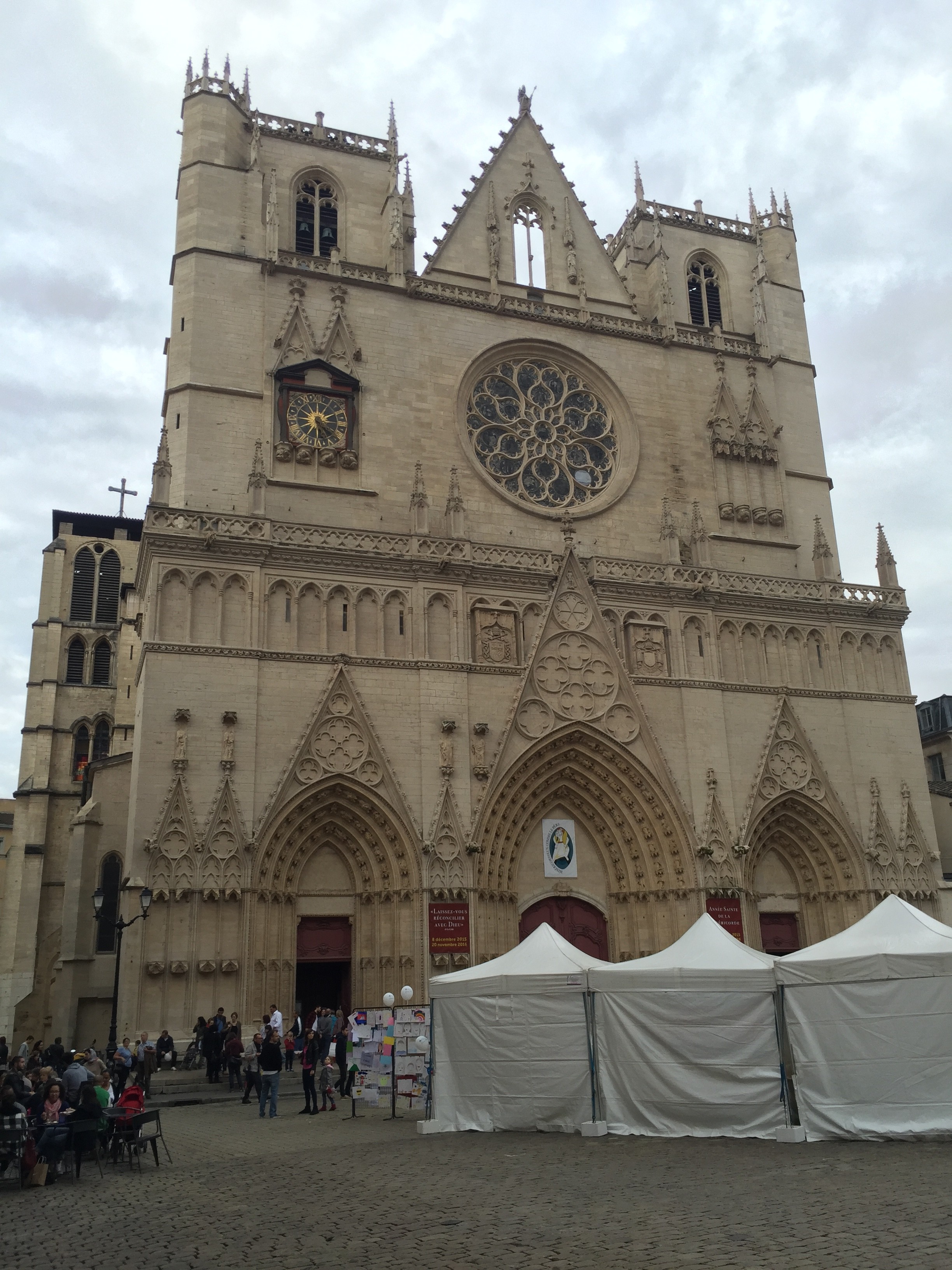 How do we leave these lovely people and this lovely place? It was not easy. We got on the road to Lyon about 11 am and it was supposed to take about 2 1/2 hours to get there. Then it started to rain; then it proceeded to pour! Even on the freeway, it was rough for Joe. Then there was an accident and we experienced about a 45 minute delay. When we finally got to Lyon we couldn’t find the car return place in spite of GPS’s best efforts. Part of the problem was that the address was close, but no cigar. Fortunately I saw the car return sign as we passed it. No problem, go around the block. Except we got in the wrong lane and wound up in a shopping center multi-tiered parking lot. We managed to get out of that (cost 50 cents for the mistake) and eventually found our way back to the Enterprise car return. After my tale of woe, the attendant forgave us for 1/4 tank of gas that we didn’t put in the car because we couldn’t find a station that sold diesel fuel. I just might have whined and complained about the error messages from we kept getting on the car’s screen which kept insisting we needed to have the car repaired. A taxi to our hotel and all was much better. Except for the hordes of people! We’ve been in the country for several days and the crowds were a shock. Paul and