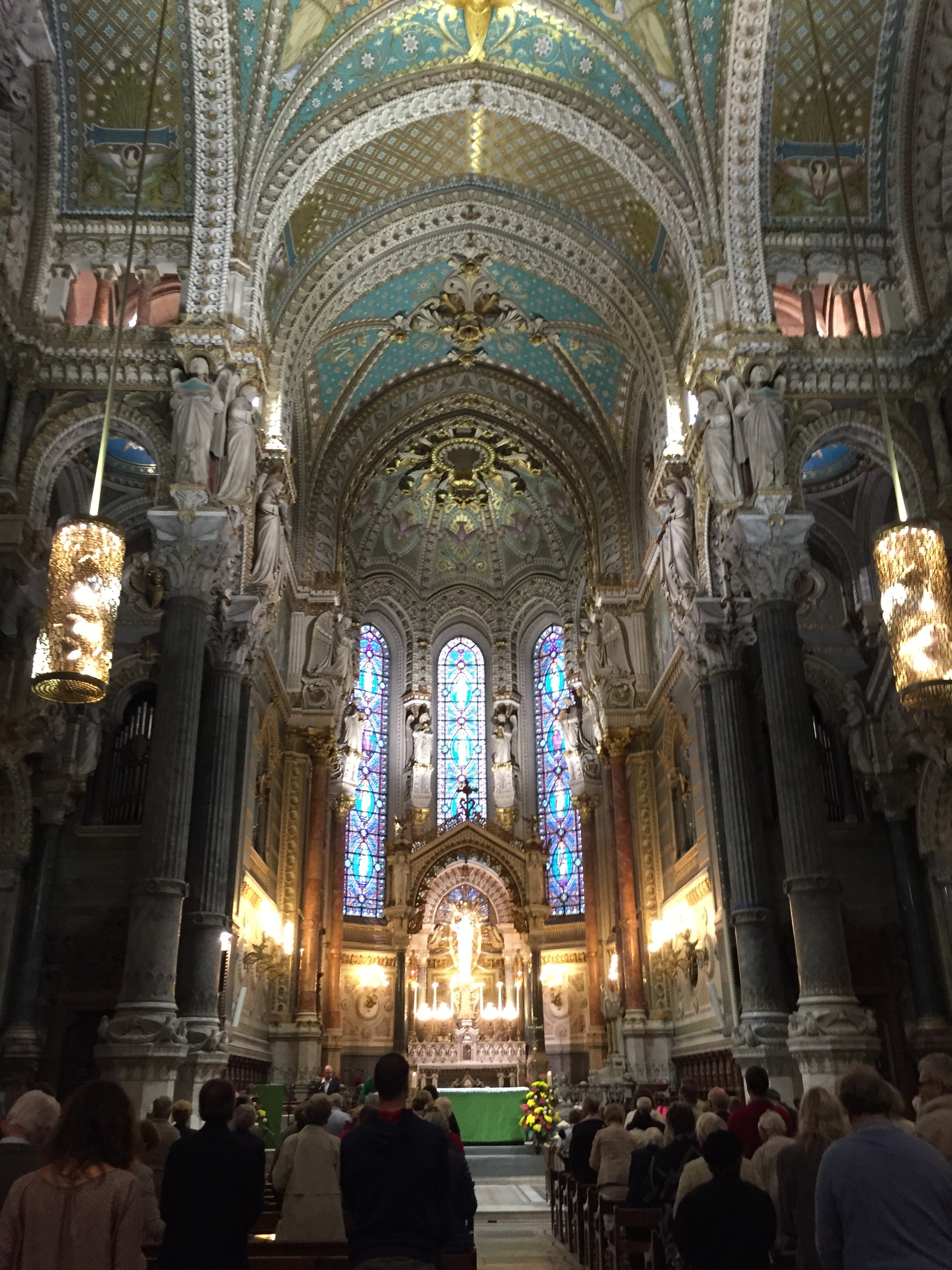Monique told us to be sure and see the Basilica atop the hill and to go up the cable car to get there. We found our way, pausing for a little nourishment of onion soup along the way. We were told the Mass was at 6:30 and we arrived at 6. When we entered the Basilica, it was quite full of people and the priest had just started the Offeratory. Oh well! The Basilica is incredibly beautiful. Even the floors are covered in colorful mosaics. The ceiling is highly decorated with paintings and low-relief sculpture. After Mass we went back down the hill to a cafe for dinner. Joe had roasted chicken and I had a great salad that was a mixture of fruits and vegetables with a hard boiled egg for protein. I asked for Lyonnaise potatoes (a delicious version of scalloped potatoes) as a side dish and when the bill came, he hadn’t charged me for them. I don’t think it was a mistake; he seemed very surprised that I even knew about their signature dish. We walked back to our hotel on increasingly uncomfortable cobblestones, hoping for an ice cream vendor. No luck. In our hotel there is a coffee machine in the lobby that dispenses several hot beverages. So I settled for a cappuccino and Joe had a chocolate. End of day and time in France. Tomorrow we fly to Malta!